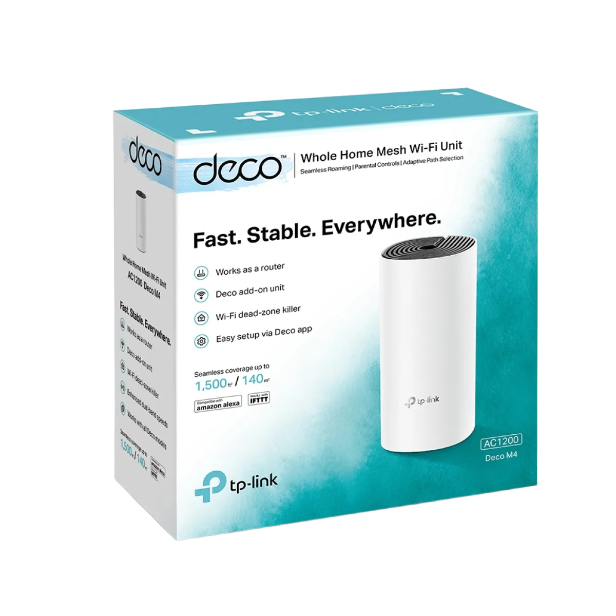 $NaNTP-Link Deco M4 (1 Pack) AC1200 Mesh Wi-Fi System Gigabit Router - White Qualcomm CPU 2x Gigabit Ethernet Ports (WAN/LAN auto-sensing) per Deco unit 1x Reset button on the underside 2x internal dual-band antennas per Deco unit - IEEE 802.11 ac/n/a 5 GHz, IEEE 802.11 b/g/n 2.4 GHz Dual Band 2.4GHz and 5GHz 300 Mbps on 2.4GHz and 867 Mbps on 5GHz WPA-PSK/WPA2-PSK Wireless Security IPv6 Support Covers up to 3800 Sq ft
