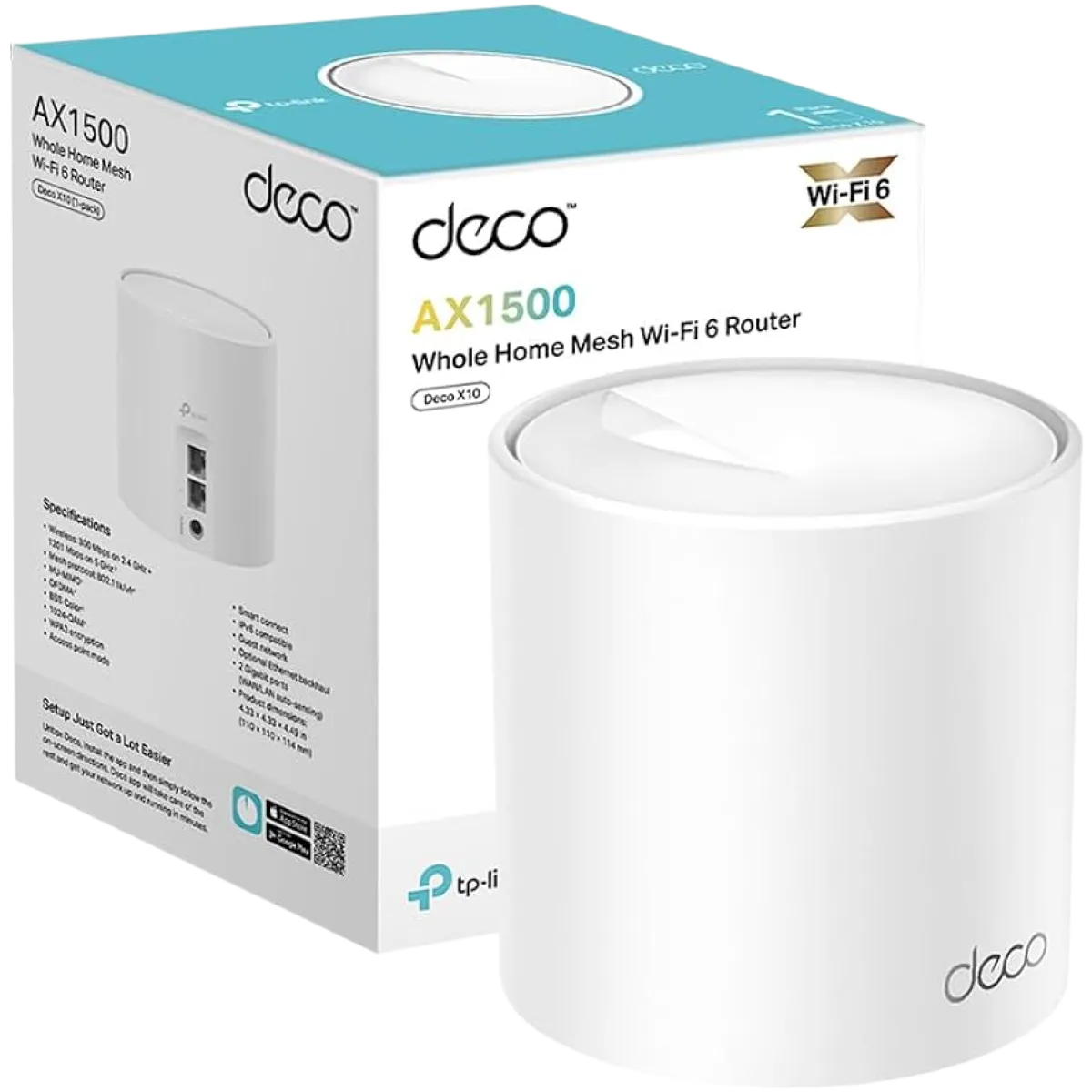 $NaNTP-Link Deco X10 (1 Pack) AX1500 Whole Home Mesh Wi-Fi 6 System - White Wifi Standard: Wi-Fi 6 IEEE 802.11ax/ac/n/a 5 GHz; IEEE 802.11n/b/g 2.4 GHz Wifi Speeds: AX1500 5 GHz: 1201 Mbps (802.11ax); 2.4 GHz: 300 Mbps (802.11n) Features: 2x Antennas (Internal) - TP-Link Mesh Technology; Beamforming Ports: 2x Gigabit Ports