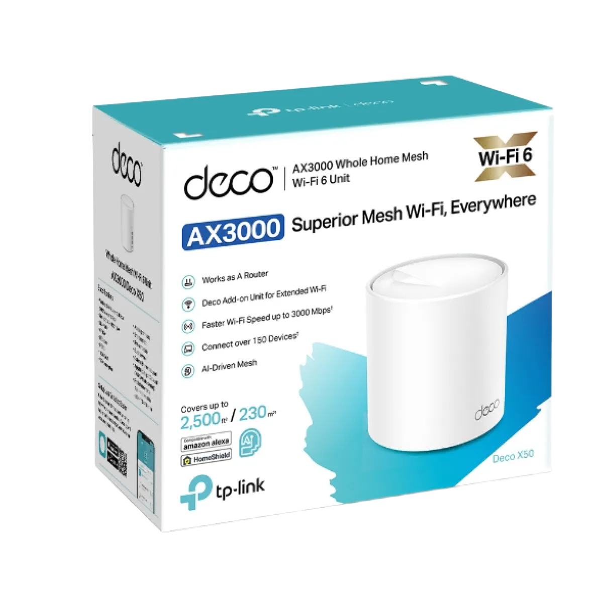 TP-Link Deco X50(1 Pack) AX3000 Indoor WiFi 6 - White Wi-Fi 6: IEEE 802.11ax/ac/n/a 5 GHz; IEEE 802.11ax/n/b/g 2.4 GHz AX3000: 5 GHz: 2402 Mbps (802.11ax); 2.4 GHz: 574Mbps (802.11ax) Guest Network 1x 5 GHz Guest Network; 1x 2.4 GHz Guest Network IP65 Waterproof and Dustproof Work with All Deco Models TP-Link Mesh Technology Provide seamless coverage 2x Gigabit ports 2x Antennas Internal Package Contents 1 × Deco X50-Outdoor unit; 1 × AC Power Cord; 1 × RJ45 Ethernet cable; Wall/Pole Mounting Kit, Installation Guide