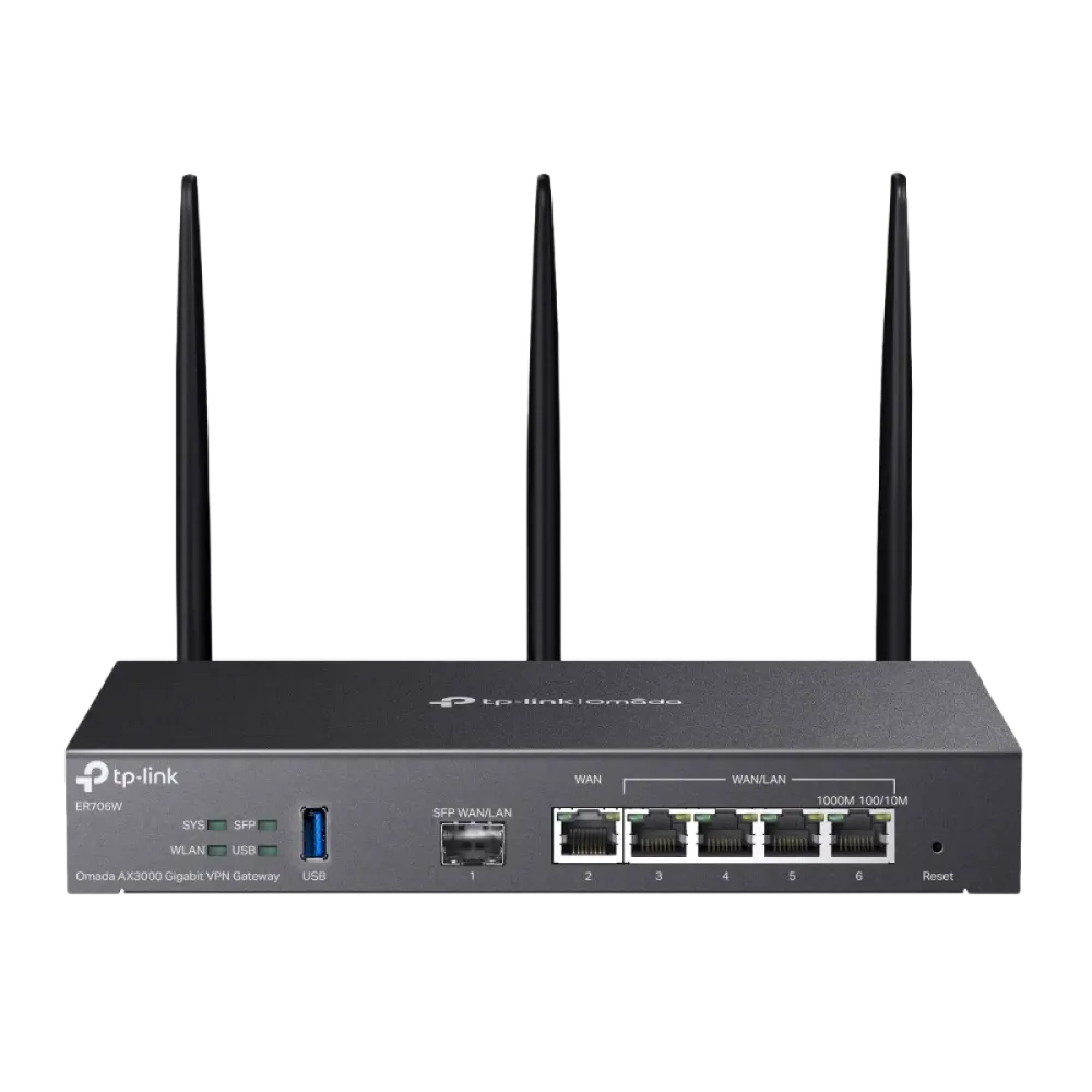 TP-Link (ER706W) Omada AX3000 Gigabit VPN Router - BlackInterface: 1x Gigabit SFP WAN/LAN Port; 1x Gigabit WAN Port; 4x Gigabit LAN/WAN Ports; 1x USB3.0 (supports USB LTE dongle and USB Storage) Power Supply: 12VDC / 2A Power Adapter Wi-Fi Frequency & Signal Rate: 2.4GHz: 574 Mbps; 5GHz: 2402 Mbps (HE160) Advanced Features: Seamless Roaming; Mesh (with EAP that supports Mesh); OFDMA; Beamforming; MU-MIMO; Wireless Encryption: WPA/WPA2/WPA3 Personal, WPA/WPA2/WPA3 Enterprise