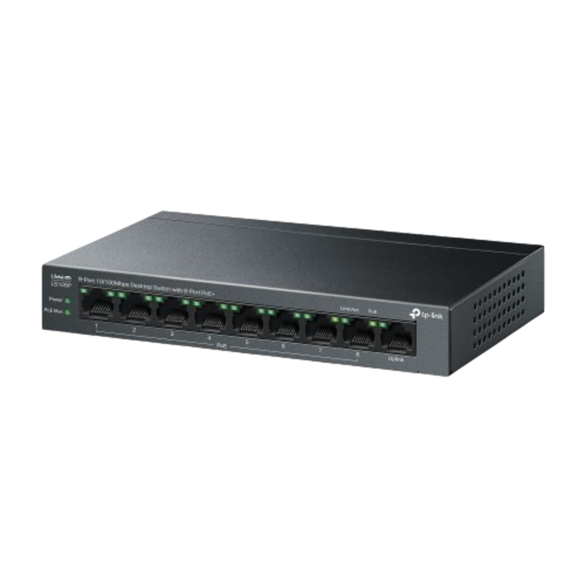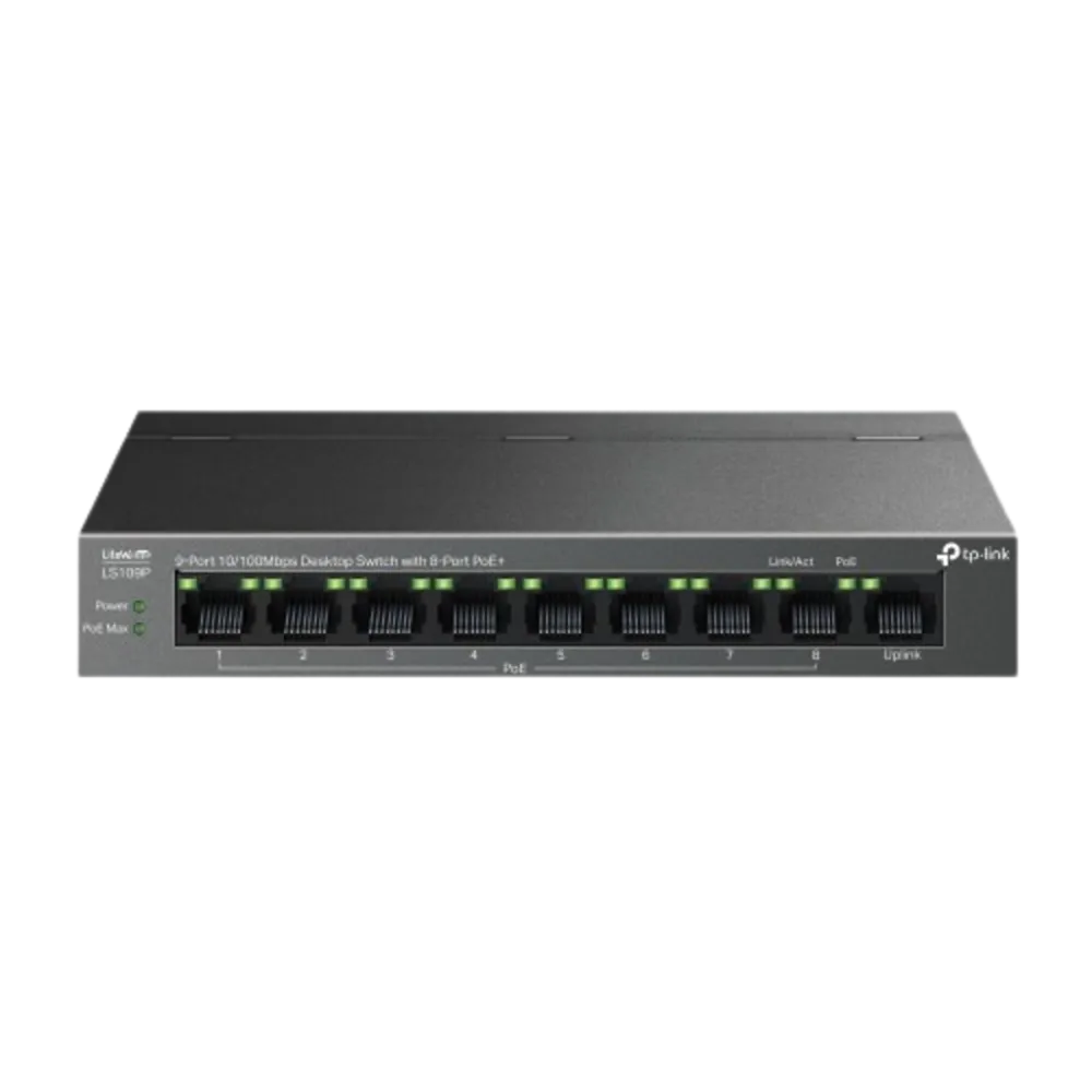 TP-Link (LS109P) 9-Port Desktop POE+ 10/100 Switch - Black Interface: 9x 10/100 Mbps RJ45 Ports (8x 10/100 Mbps 802.3af/at PoE+ Ports); AUTO Negotiation; AUTO MDI/MDIX Fan: Fanless Power Supply: External Power Adapter (Output: 53.5 VDC / 1.31 A) Switching Capacity: 1.8Gbps Packet Forwarding Rate: 1.3392Mpps MAC Address Table: 2K Jumbo Frame: 1.5KB