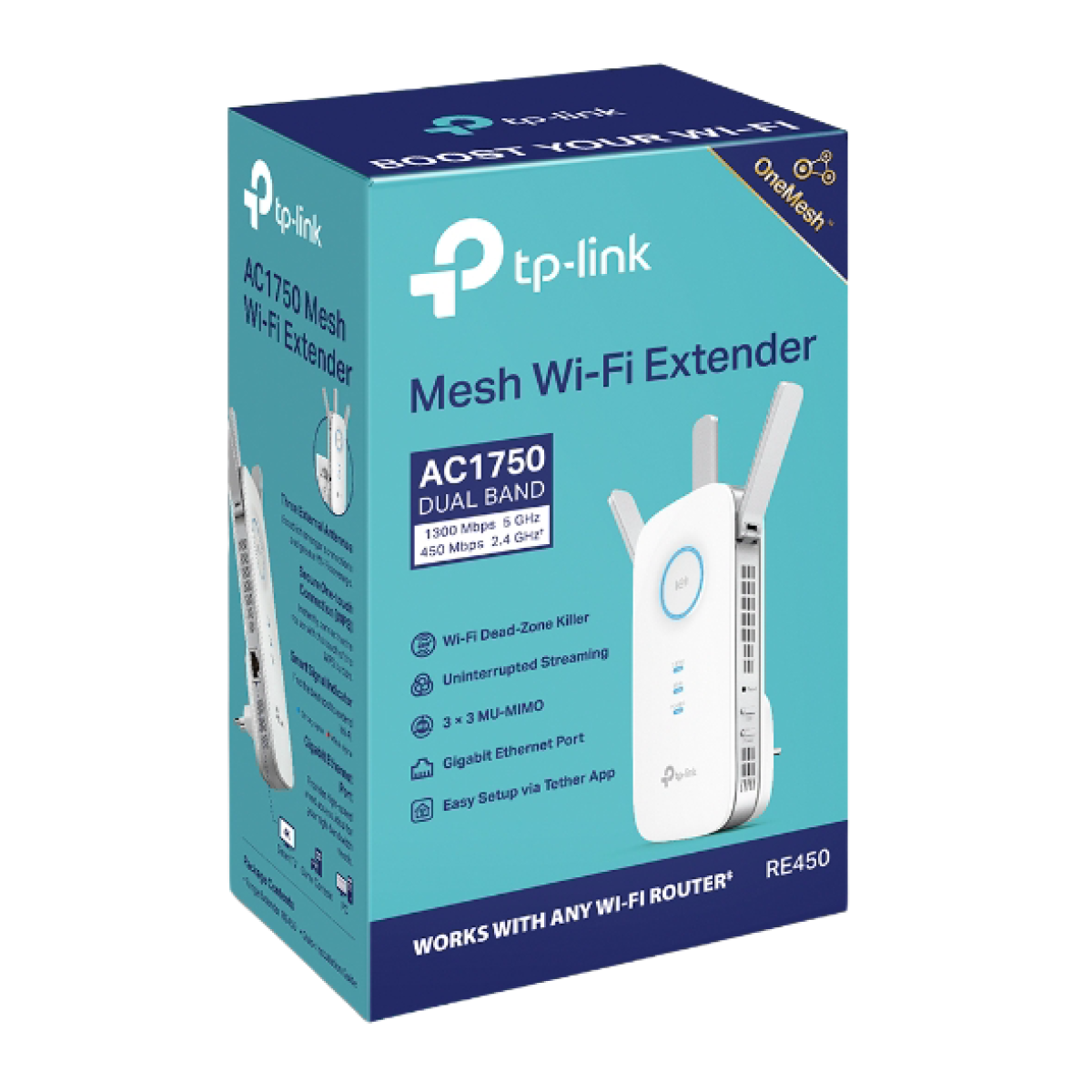 TP-Link (RE450) AC1750 Wi-Fi Range Extender - Socket Mounted - White Range Extender/Access Point AC1750 Dual Band Wi-Fi Simultaneous 450Mbps on 2.4GHz + 1300Mbps on 5GHz Three Antennas Gigabit Ethernet port Act as a wireless adapter to connect a wired device to your network at Gigabit speed Interface 1x Gigabit Ethernet Port Plug Type EU, UK, US, AU, KR, JP