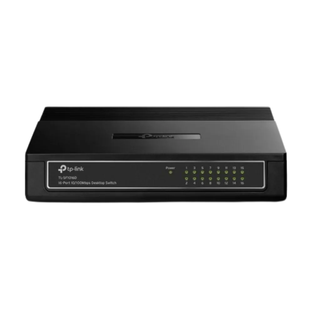 TP-Link (TL-SF1016D) 16-Port 10/100Mbps Desktop Switch - Black Interface: 16x 10/100 Mbps RJ45 Ports; AUTO Negotiation/AUTO MDI/MDIX Fan Quantity: Fanless External Power Supply: External Power Adapter(Output: 5.0VDC / 0.6A) Mac Address Table: 2K Features: Green Technology, 802.3X Flow Control Transmission Method: Store and Forward