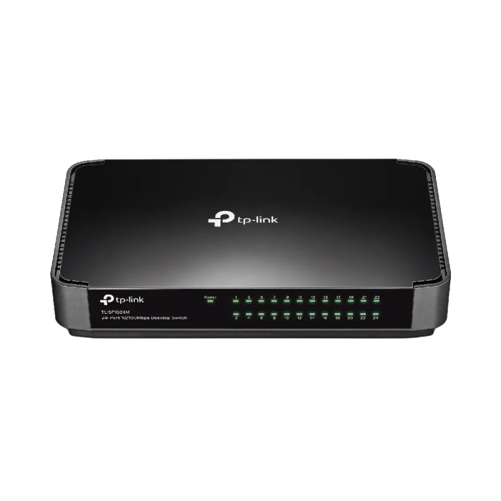 TP-Link (TL-SF1024M) 24-Port 10/100Mbps Desktop Switch - 24 Auto - Negotiation RJ45 ports supports Auto MDI/MDIX - Green Ethernet - IEEE 802.3x - Durable plastic case - desktop or wall-mounting design - Plug-and-Play installation - no configuration required.