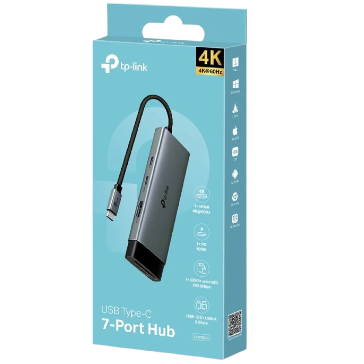 TP-Link (UH7020C) USB-C 7Port Hub - Space Gray Input: USB3.0-C Output: 1x 4K@60Hz HDMI; 1x SD & microSD UHS-I; 1x 100W Power Delivery, 1x USB-C; 2x USB-A Data Ports. Case: Aluminum Alloy Case Support: Plug & Play