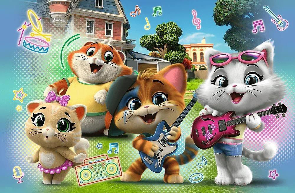 After assembling the puzzle, a large 600 x 400 mm image will be formed. The colourful puzzle features the singing characters from the TV series "44 Cats".