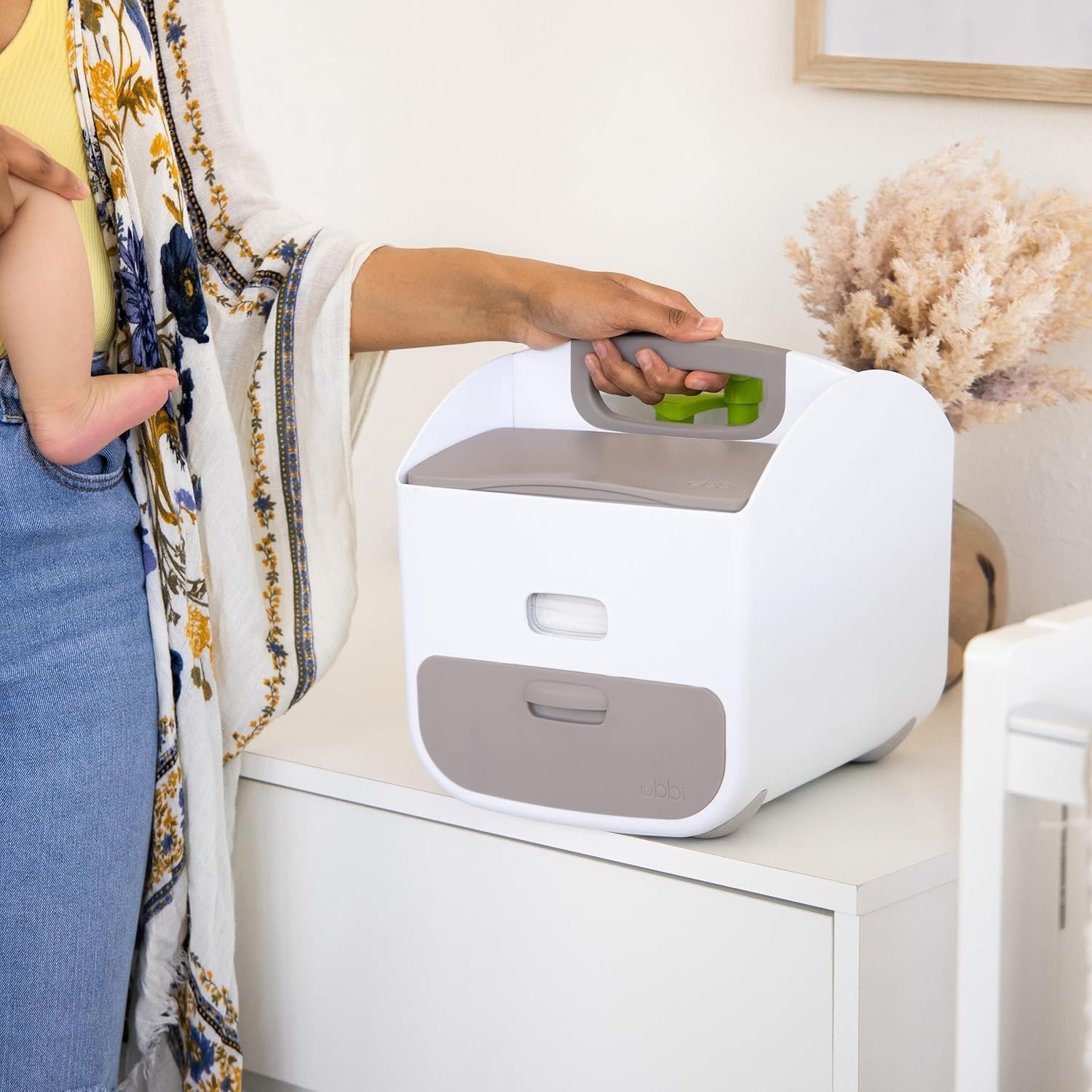 Organized Storage: Designed with fitted compartments for diapers, Ubbi wipes dispenser with convenient window to see wipes, lotions, and baby accessories, this caddy organizer ensures everything has its place, making diaper changes hassle-free and organized.