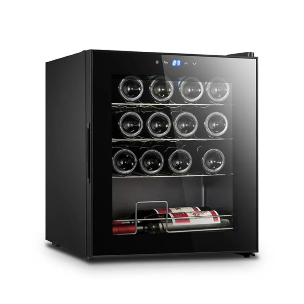 Product: Compressor Wine Cellar Power Consumption: 85 W Bottle Capacity: 16 bottles Cooling Capacity: 5-18°C / 41-64°F (at ambient temperature ≤ 25°C) Features: Touch-screen control panel with automatic control panel lock LED temperature display in °C and °F Mirror glass door Interior LED light 3 chrome-plated wire shelves and 1 wire rack Auto defrost Dimensions (WxDxH): 430 × 450 × 560 mm