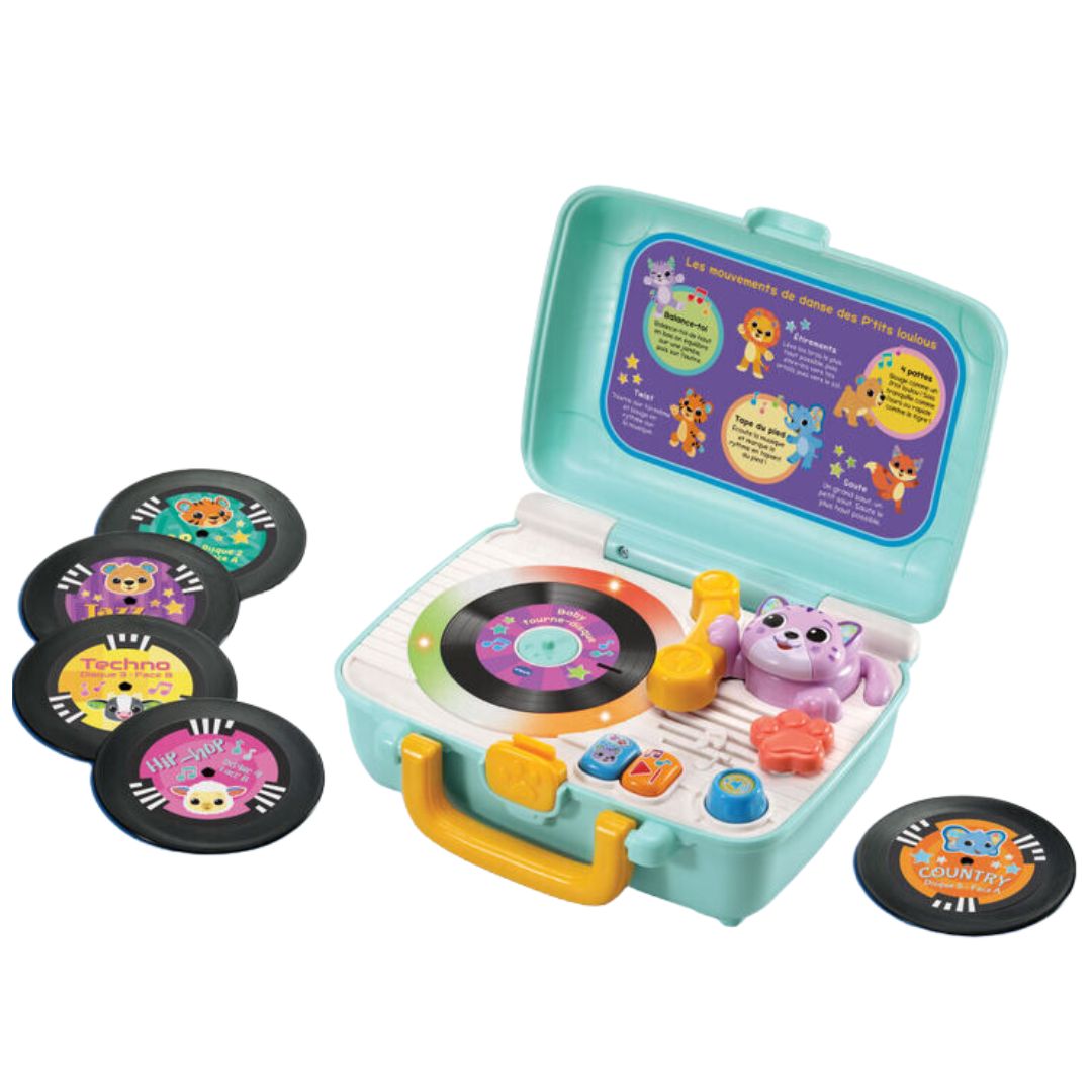 This Vtech Baby Tourne Disque interactive DJ toy features five double-sided records, allowing young children to explore various music styles such as jazz, pop, techno, country, and hip hop, while also enjoying fun animal sounds. The turntable lights up and includes a playful kitty assistant that bobs along to the music, encouraging creativity and engagement in musical play.Key Features: