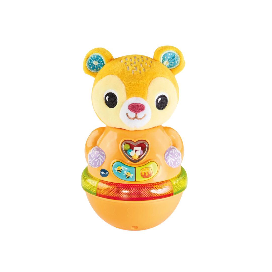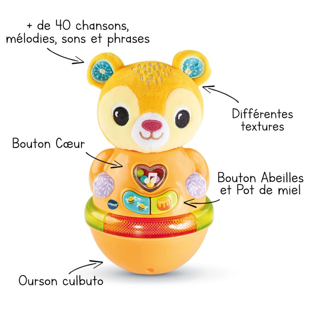 The Vtech Bonbon, Mon Ourson Culbuto is an engaging toy designed for babies to enjoy as they watch the bear sway to cheerful songs and melodies. This interactive toy helps develop motor skills, touch sensitivity, and auditory awareness.