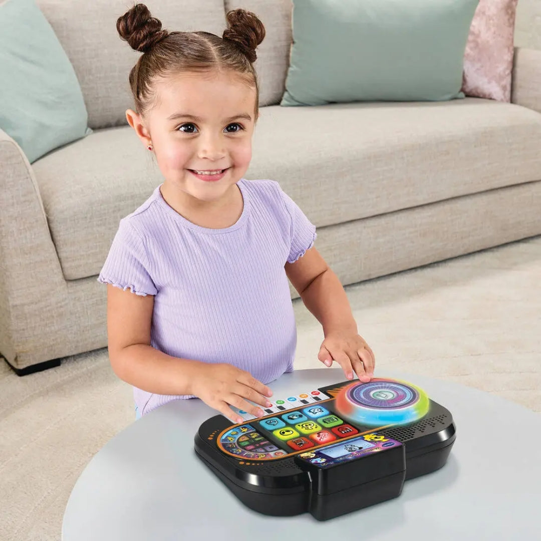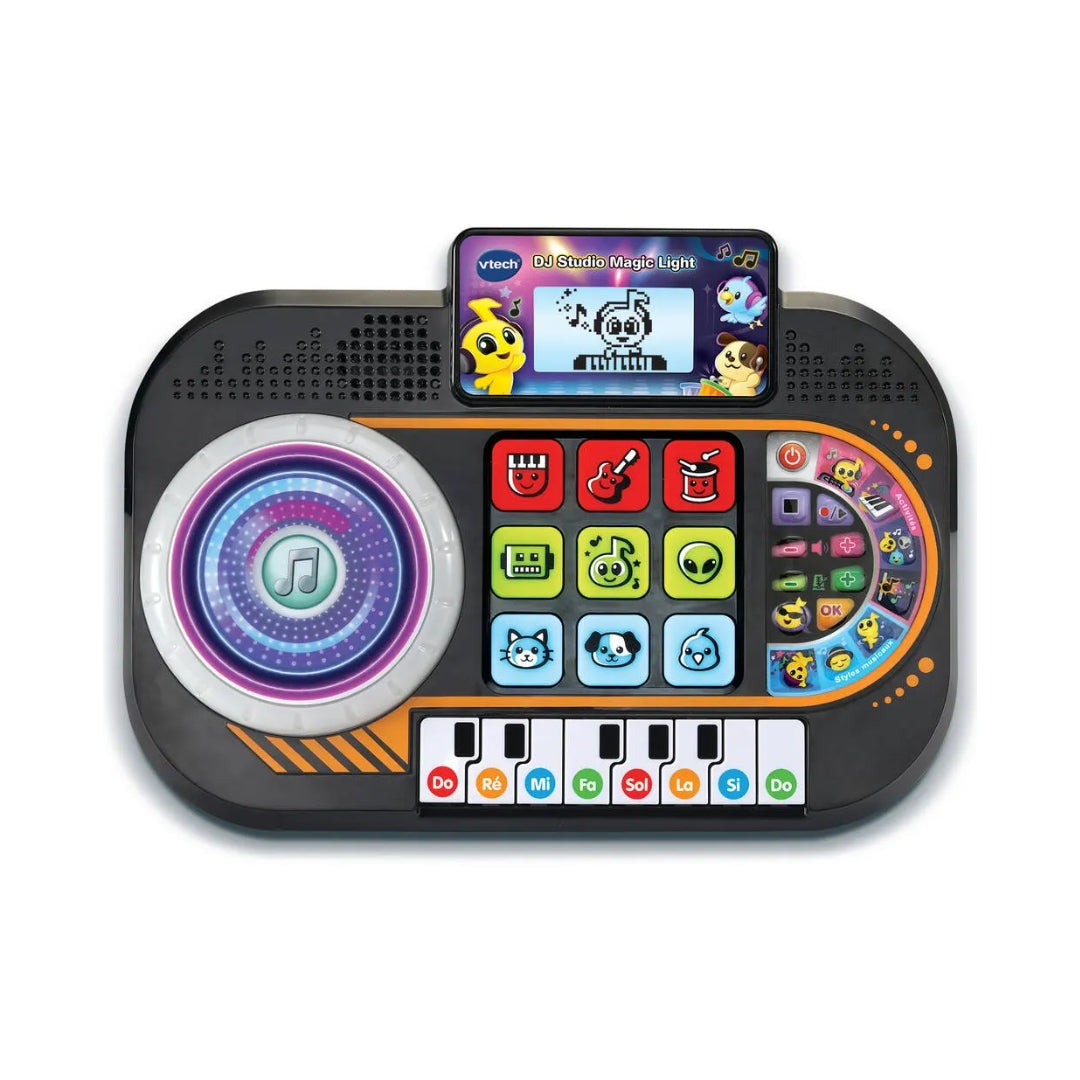Kids can take their first steps as DJs with the DJ Studio Magic Light turntable, designed for ages 3+. Features include a scratch disc and light-up pad for fun sounds, 8 piano keys to explore musical notes, a backlit LCD screen, volume and tempo controls, and a record/pause button. Four guided activities help create music, with 9 songs, 27 melodies, and over 1,000 sound combinations. Automatic shut-off and volume control included perfect for aspiring young DJs!