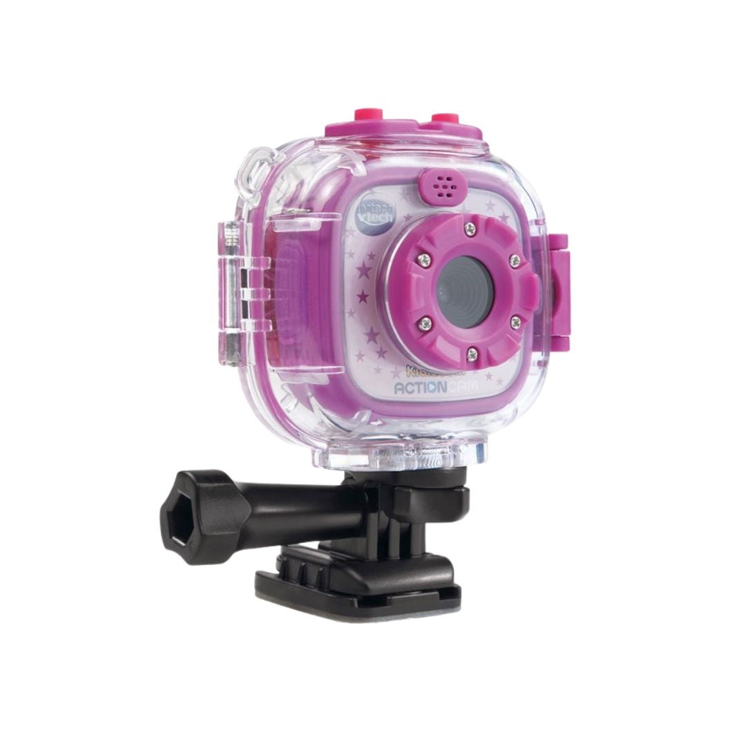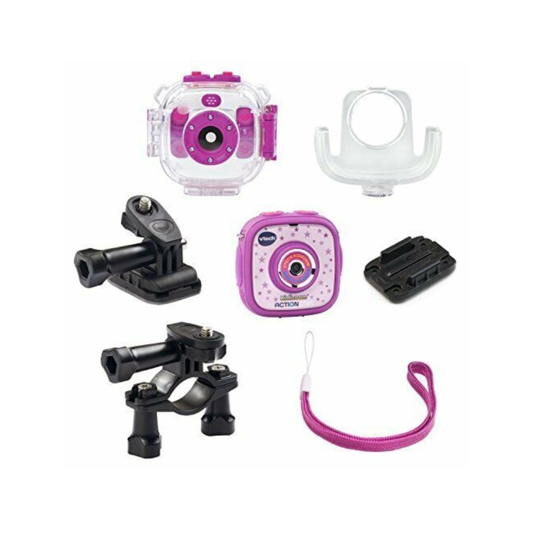 The VTech KidiZoom Purple Action Cam 180 is a versatile all-terrain camera designed for kids. With its robust design and fun features, it allows children to capture photos and videos during their adventures, whether on land or in water.