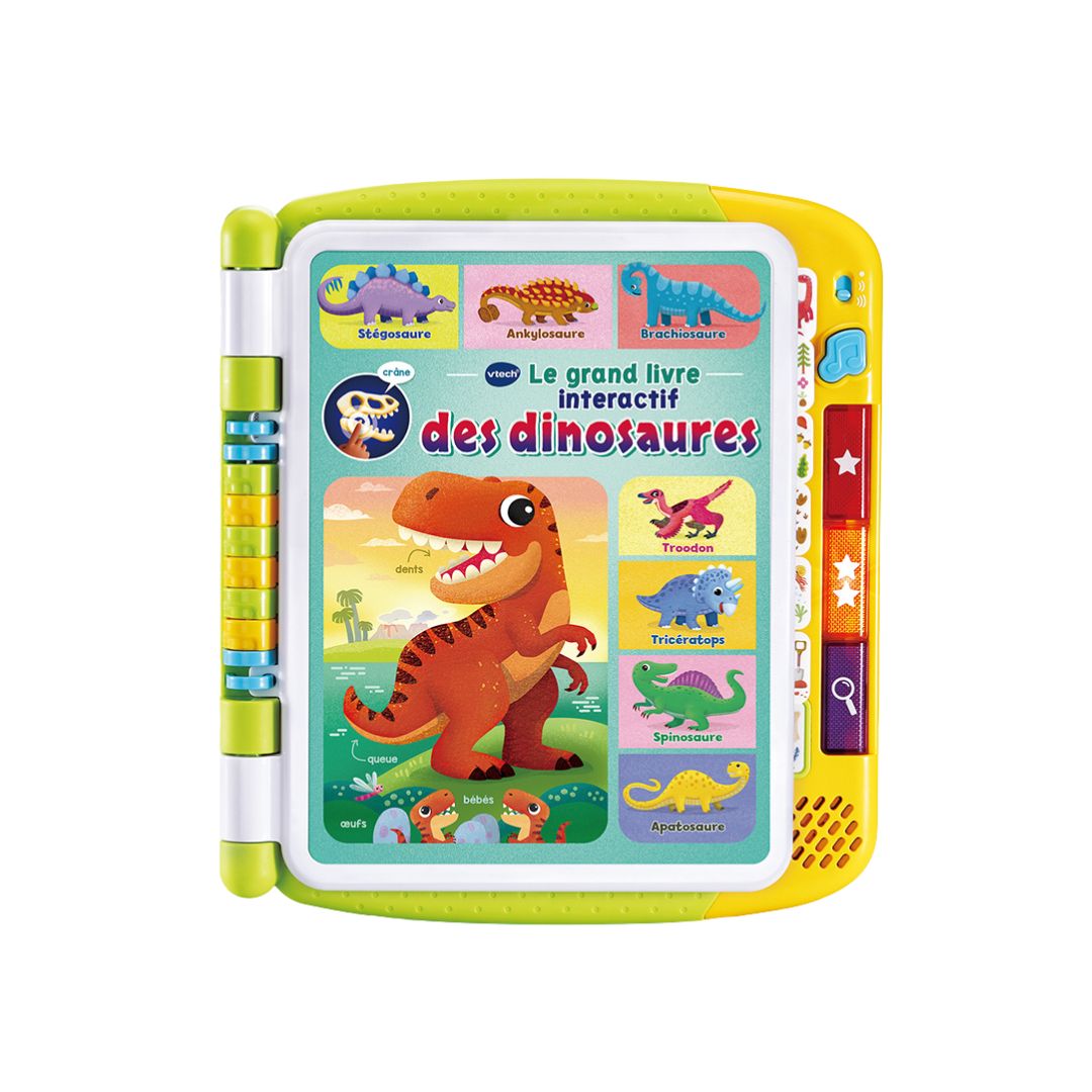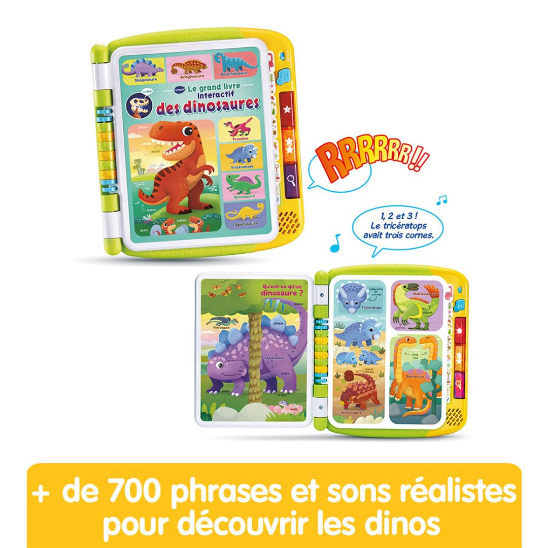 The Vtech Le Grand Livre Interactif des Dinosaures is a talking book designed for children aged 3 to 7, offering a fascinating exploration of the dinosaur world. With 7 double-sided pages, this interactive book features over 200 touch points that trigger more than 700 realistic phrases and sounds, providing an engaging and fun learning experience.