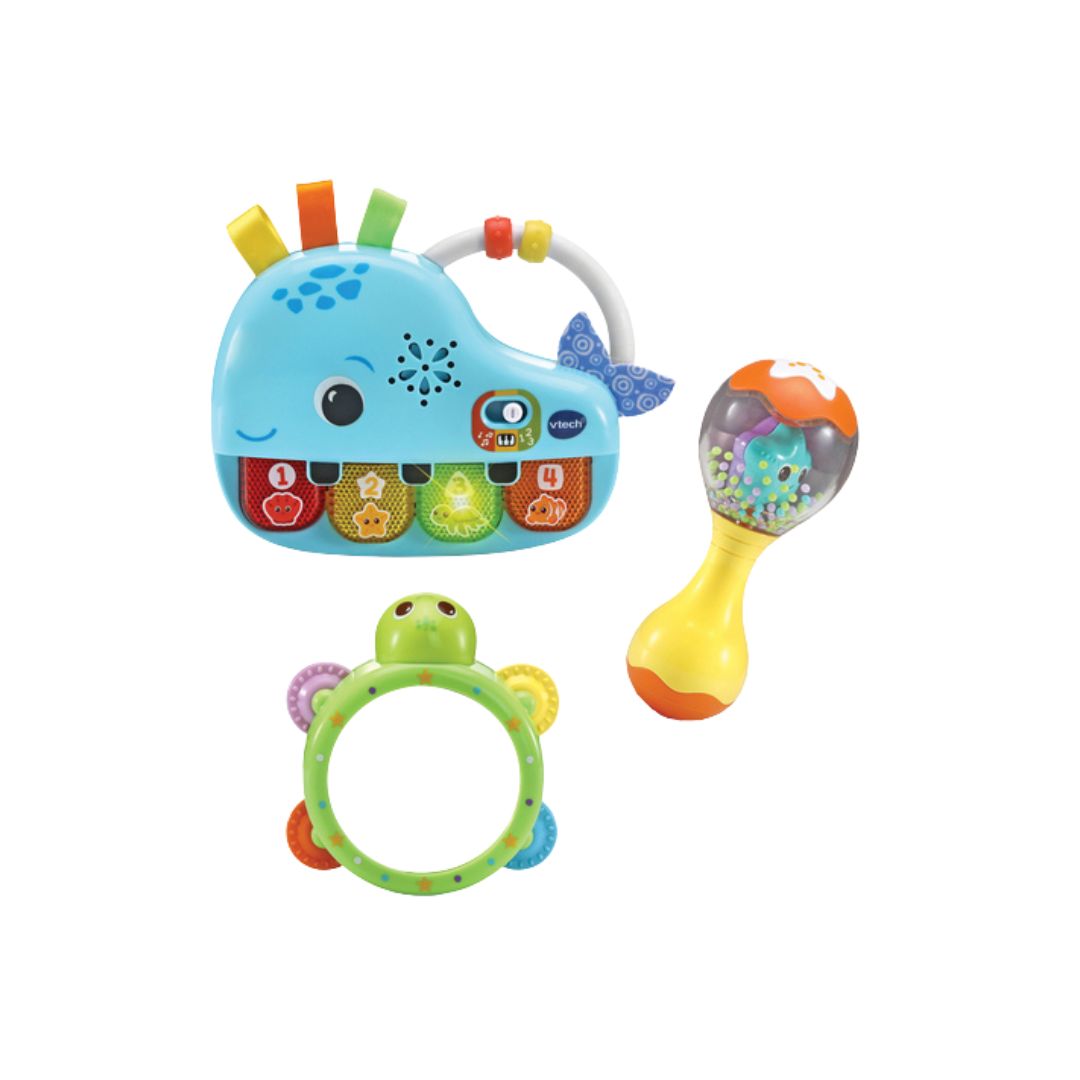 The Vtech Ocean Buddies Animal Bandآ is designed to introduce babies to music. It includes a mini piano, a tambourine, and a maraca rattle, all tailored for small hands to encourage early musical exploration.