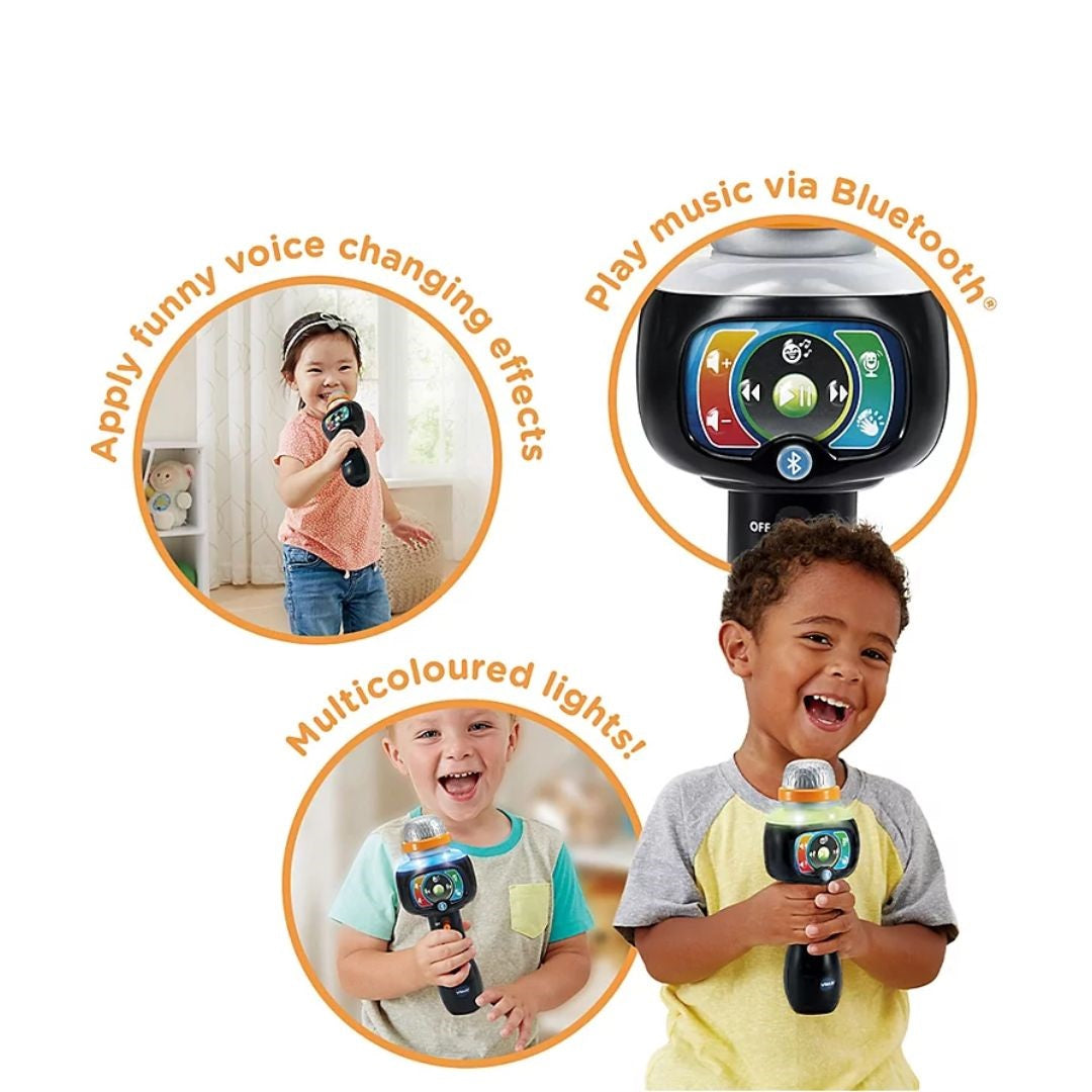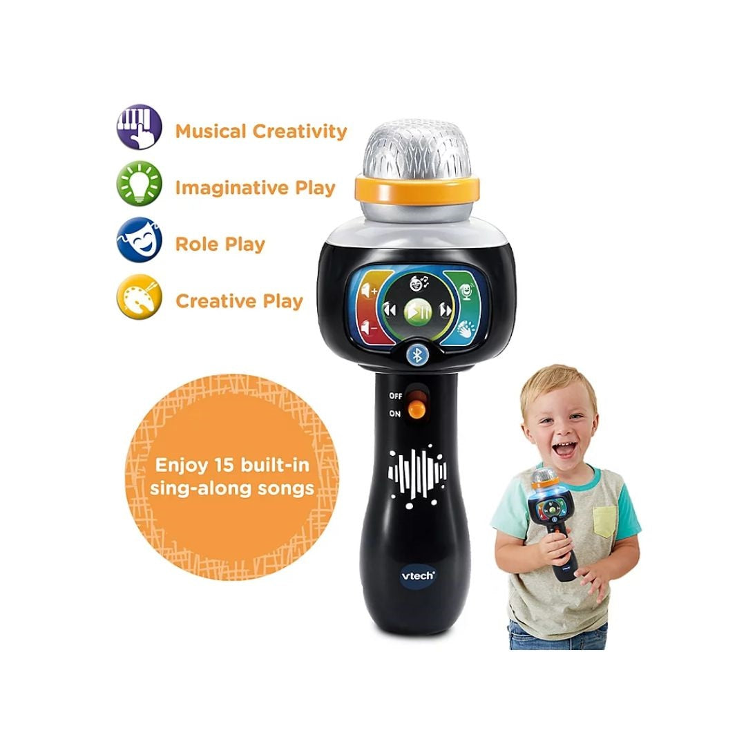 The Vtech Singing Sounds Microphone is the perfect companion for endless musical fun! This microphone allows kids to connect to their own music players via Bluetooth and sing along to their favorite tracks.