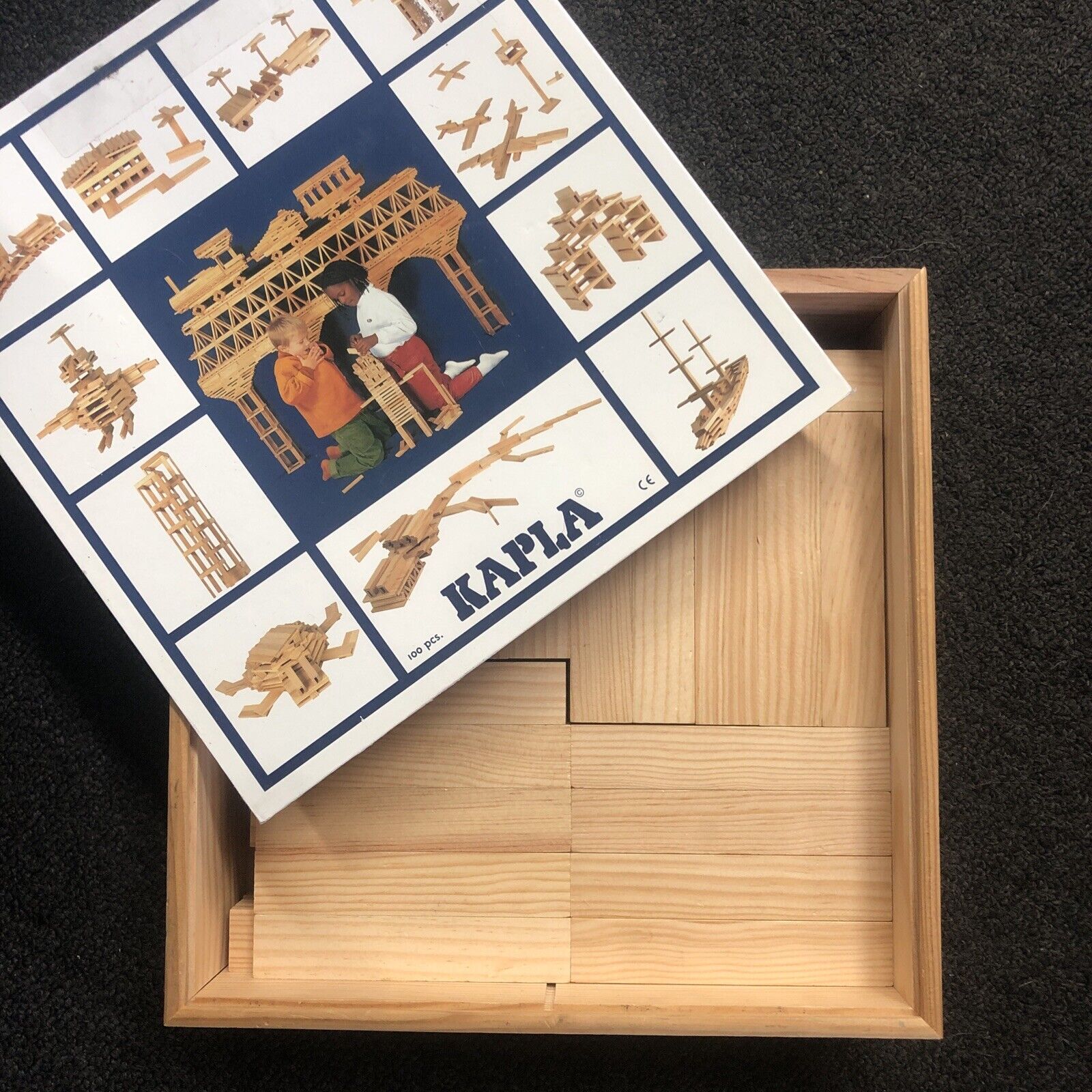Kapla 100 planks in a wooden box. Kapla is a wooden construction game for children age 3+. It is a pedagogical game with an artistic purpose. The concept : one plank, multiplied indefinitely, allows you to create countless constructions. The planks are simply balanced on top of each other, without glue or fixation point. The â€کbuilder’ is thus totally free to create and to experiment according to his or her inspiration.