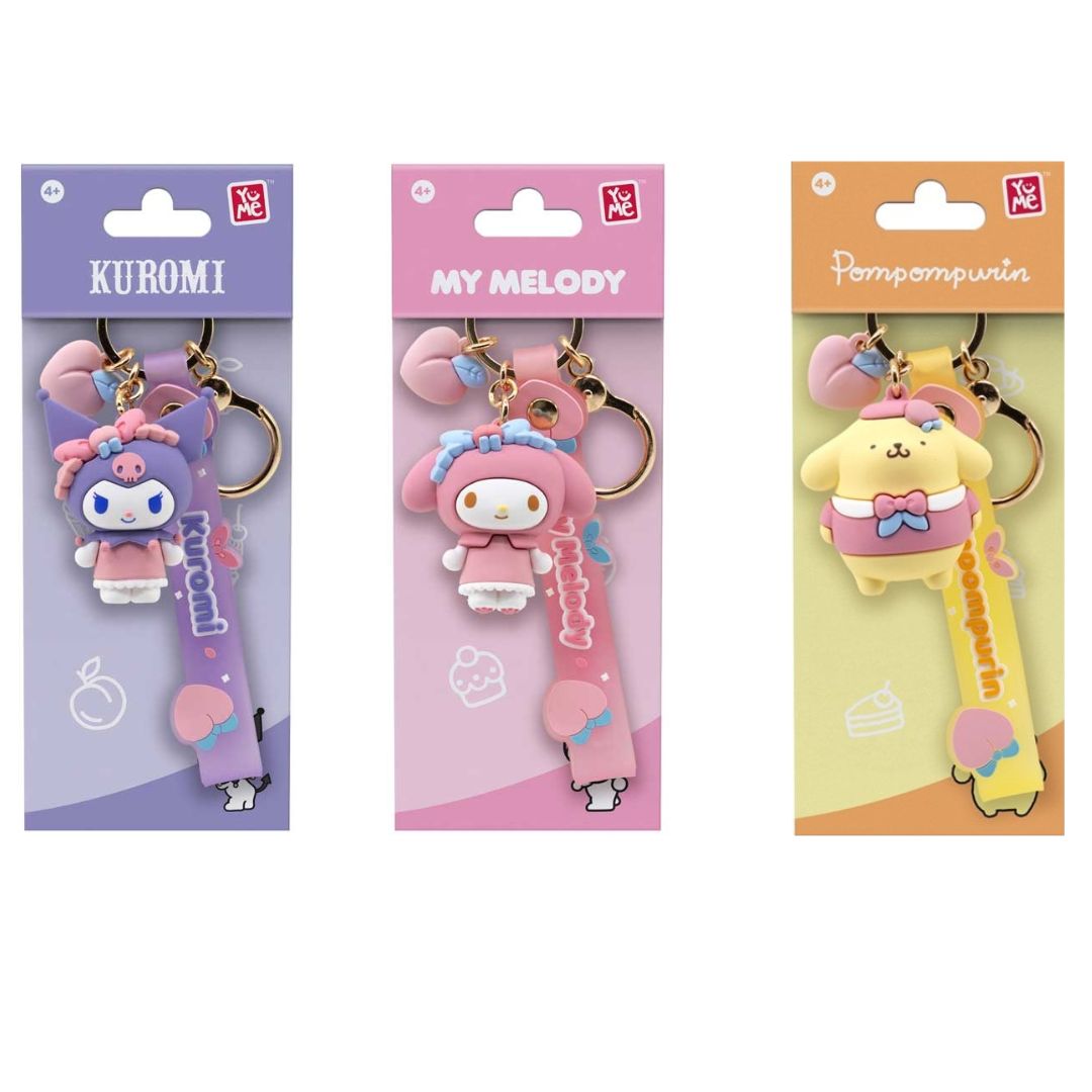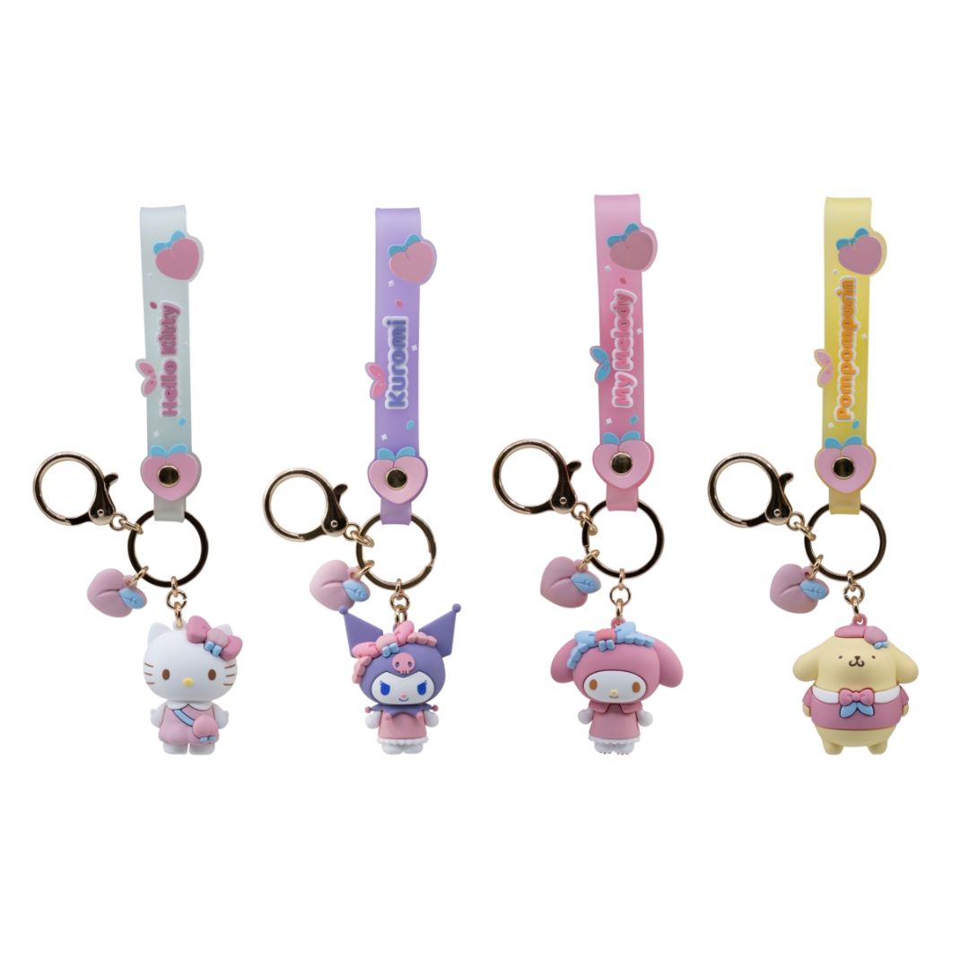 - Features four keychains: Hello Kitty, Pompompurin, Kuromi, and My Melody