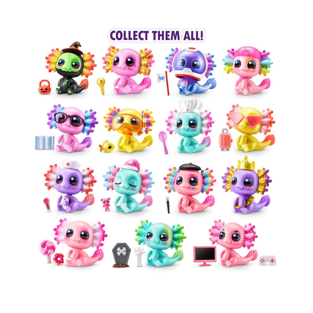 - Each axolotl features a distinct design and comes with fun accessories