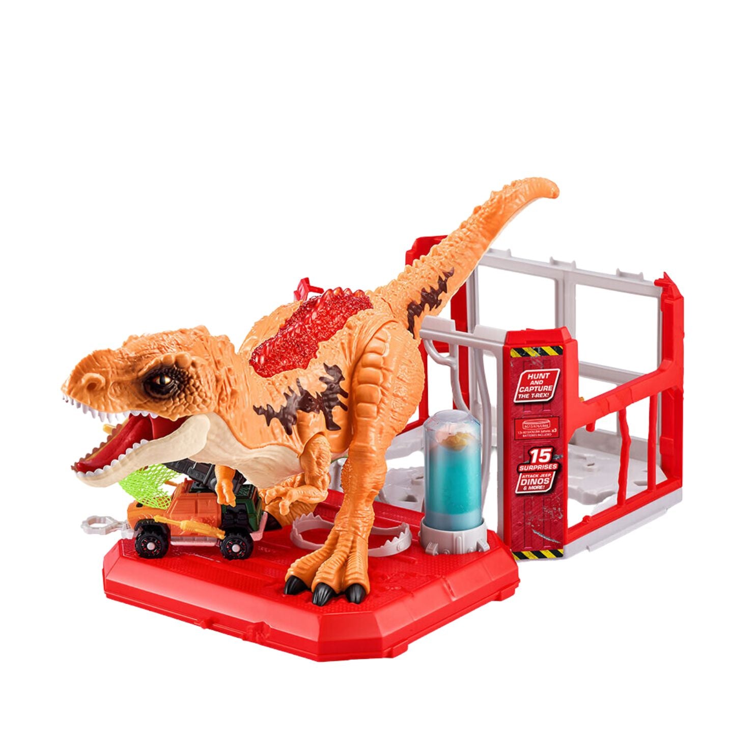 - Includes vehicles and accessories to race to the scene and capture the Dino using firing weapons and traps