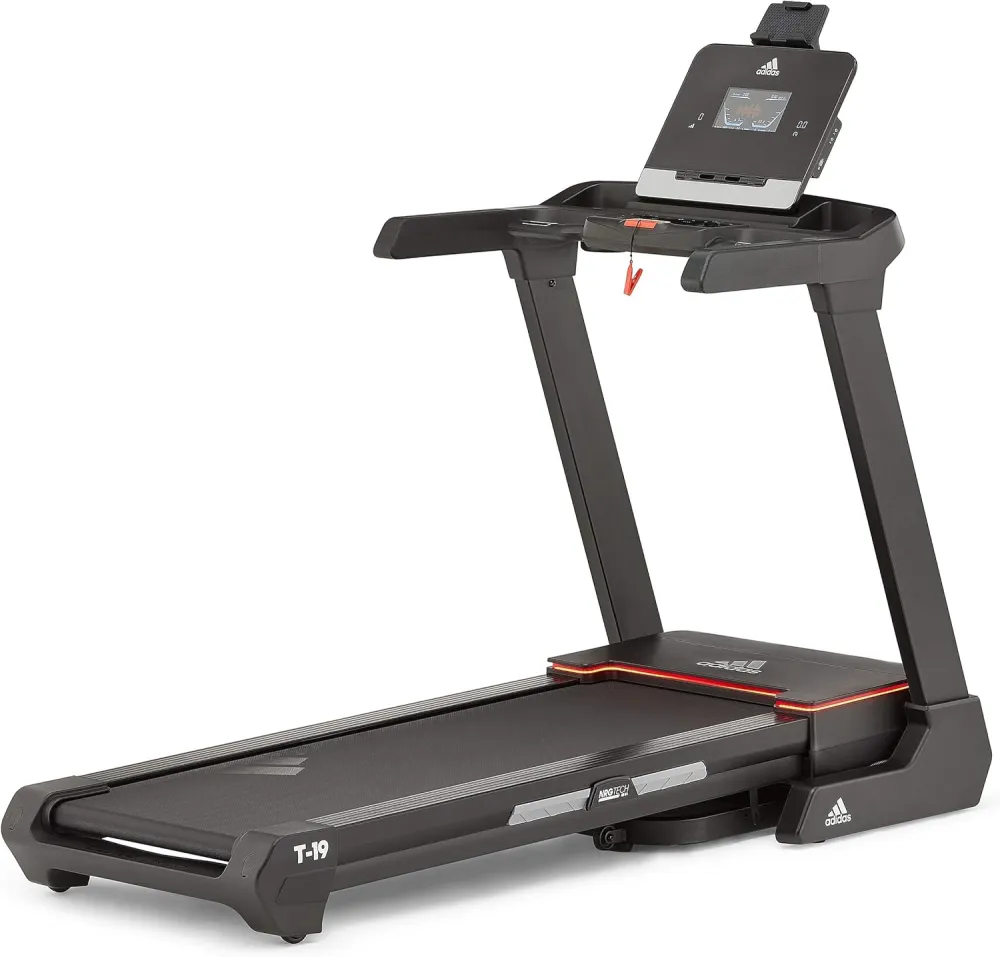 The adidas T-19 treadmill is built around a robust 3.5 Hp motor, which delivers speeds of up to 12.4 mph across 15 levels of power incline. The T-19 can effectively take you from a gentle walk all the way up to a mountainous sprint, making it an ideal running machine for all fitness levels. A spacious running area of 55.1” x 20”, along with the NRG cushioned running deck, the T-19 provide you with all the freedom and comfort you need to rack up the miles and improve your overall fitness, strength and cardio endurance. The NRG cushioning technology has been designed specifically to absorb the impact of your foot strike and help to reduce strain on sensitive joints. 24 pre-set fitness programs, plus 3 target, 3 heart rate controlled and 3 custom workouts provide you with a varied indoor running experience designed to challenge and motivate you. The 8” LCD screen will keep you updated with all the live performance metrics you need, including speed, time, distance, calories, pulse, heart rate and incline. The T-19 is compatible with Zwift (AVUS-10421BT model only), allowing you to create a more immersive online running experience built around a connected global community of runners. Also syncing with Kinomap (AVUS-10421BT model only), the app features a whole host of challenges and scenic motion videos, helping you tailor and track your workouts from your phone, or even compete with your friends in multiplayer mode. An adjustable smartphone and tablet holder can be found above the main console, which gives you an optimum viewing angle for watching movies and boxsets while you run. You can also connect your device via Bluetooth (AVUS-10421BT model only) to the onboard speaker system and blast out your favourite motivational music tracks to keep you going. Highlights: 0.5 - 20 km/h (0.3 - 12.4 mph) speed range takes you from a gentle walk to a fast sprint 15 levels of electronic incline allow you to adjust the elevation and increase the challenge Adjustable fan helps to keep you cool while you exercise and mimics outdoor running Adjustable smartphone and tablet holder provides an optimum viewing angle Built-in transport wheels make it easy to move the treadmill around your home as you wish Clear and easy to use 8" LCD screen provides you with all the feedback you need to progress Console feedback: speed, time, distance, calories, pulse, incline, heart rate, target heart rate Fitness programmes include 24 pre-set, 3 custom workouts, 3 target and 3 HRC Floor level adjustments make sure you have a solid, stable and safe running platform Integrated hand pulse sensors allow you to quickly check your pulse on the move NRG cushioning technology softens impact and helps to reduce strain on sensitive joints Robust 3.5 Hp motor delivers exceptional performance Setup dimensions: (L) 185 x (W) 87 x (H) 154 cm / (L) 72.8" x (W) 34.1" x (H) 60.5" Signature adidas Ultra Series red LED lighting surrounds the motor hood Soft drop folding mechanism lets you fold up the running deck when not in use to help save space Solid, dependable build quality results in a high maximum user weight of 150 kg (330 lb) Spacious running area of 140 x 51 cm (55.1" x 20") makes it suitable for runners of all heights Bluetooth speakers connect to your device so you can immerse yourself in your workout playlists Water bottle holder ensures you can easily stay hydrated while you exercise Zwift compatible (AVUS-10421BT model only) - immersive running experience connects you with runners across the globe Kinomap compatible (AVUS-10421BT model only) - run real-world routes, challenge your friends and analyse workouts Not all versions of this treadmill are Bluetooth enabled, please check with the retailer