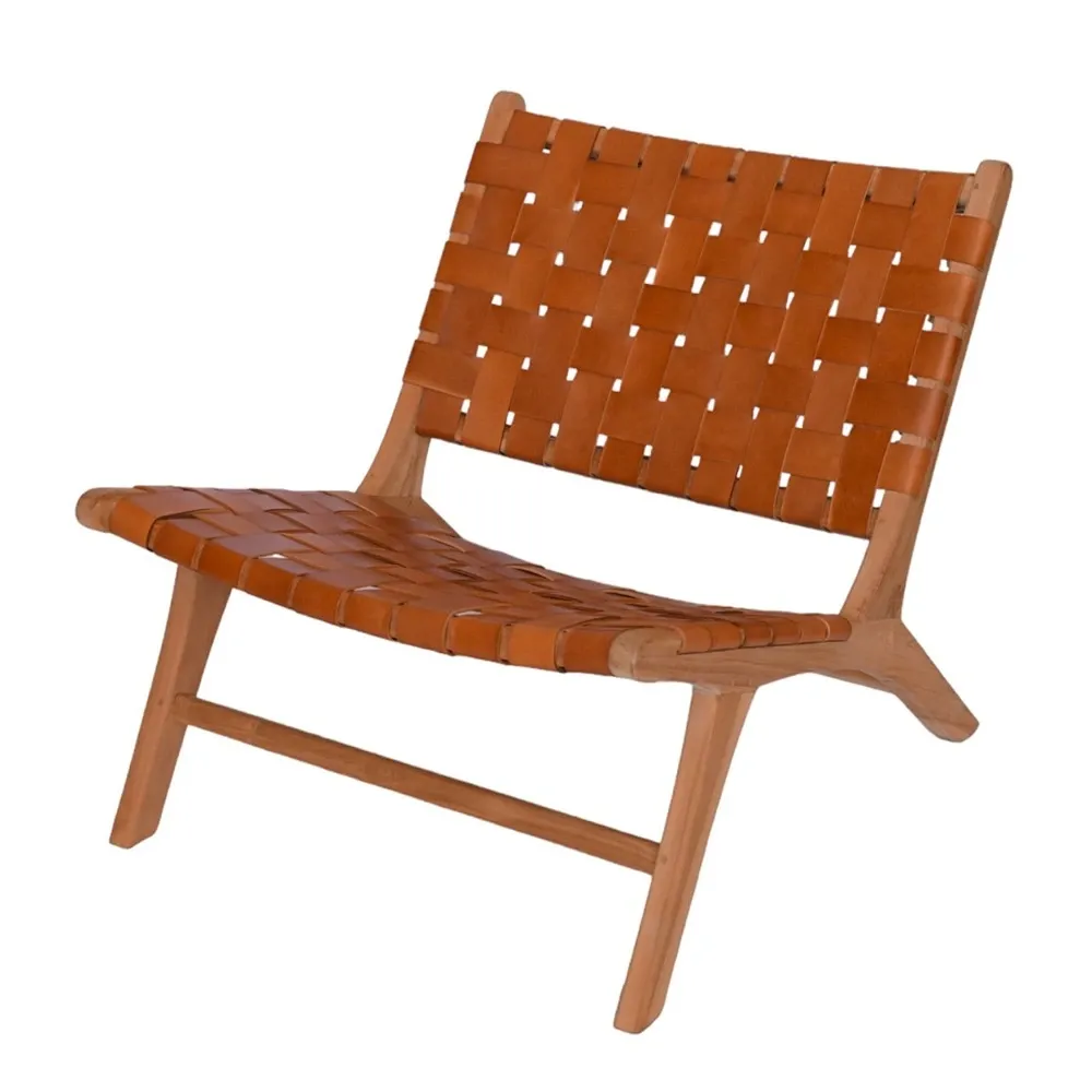 Outdoor armchair with teak wood frame and perforated leather finish.