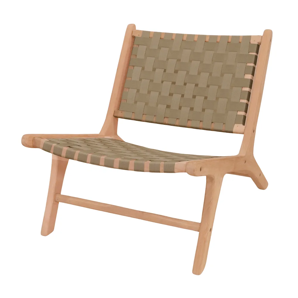Greige outdoor armchair with teak wood frame and hard-fabric upholstery.