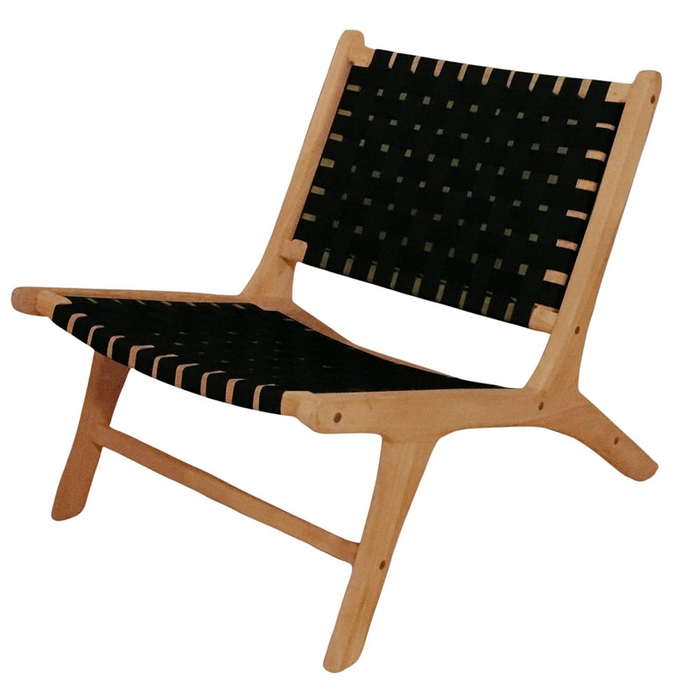 Black outdoor armchair with teak wood frame and hard-fabric upholstery.