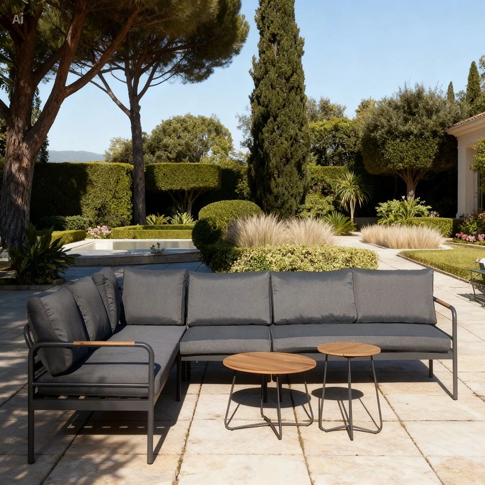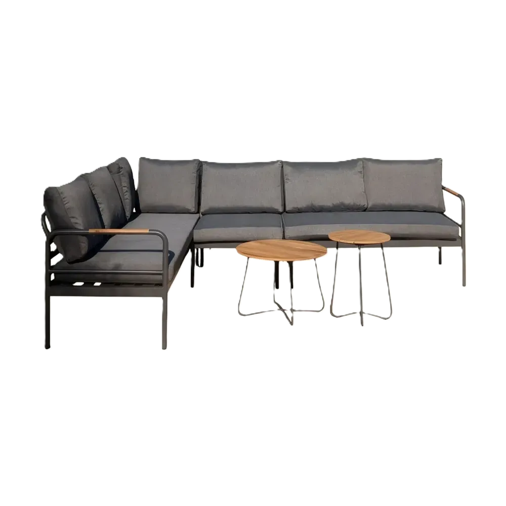 Grey corner outdoor sofa set with aluminium and teak wood frame, corner lounge and two tables.