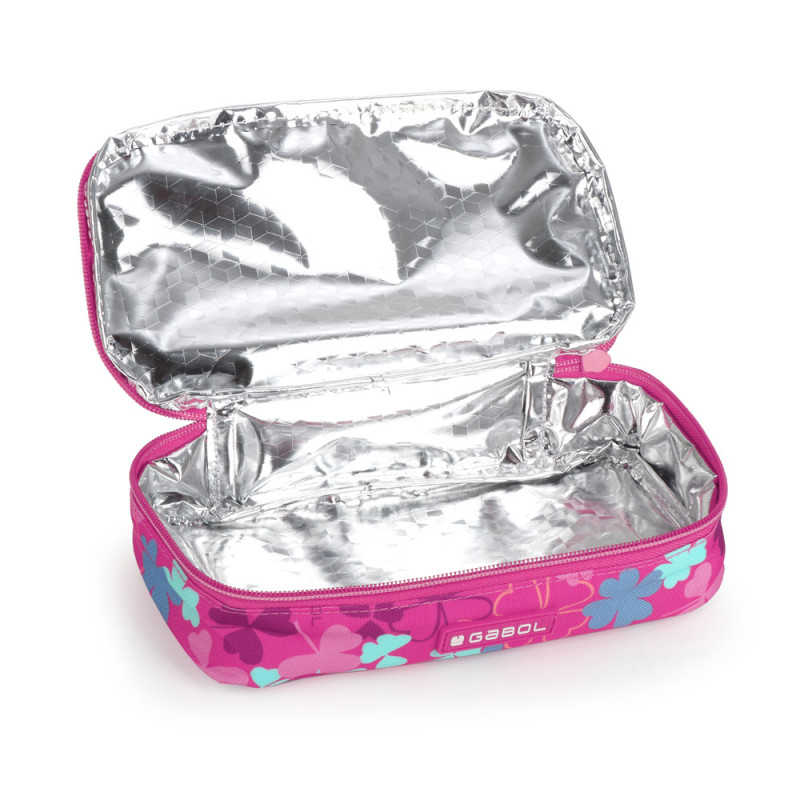 Gabol CLOVER thermal food carrier. BPA-free thermal food carrier. Made with PVC-free material and high-quality, high-density fabric. Water-resistant. Includes a name tag. Strap for attaching to a trolley or suitcase. Padded interior.