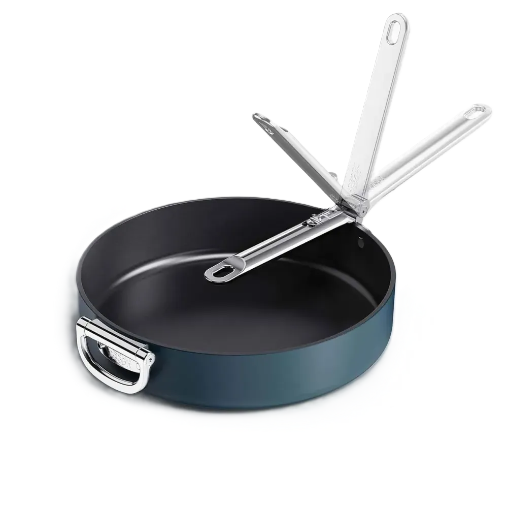 High-performance, healthy Sol-gel ceramic non-stick coating that's free from PTFE, PFAS, PFOA, Lead and Cadmium Folding stainless-steel handle saves up to 50% more space than a standard pan and 20-year lifetime tested