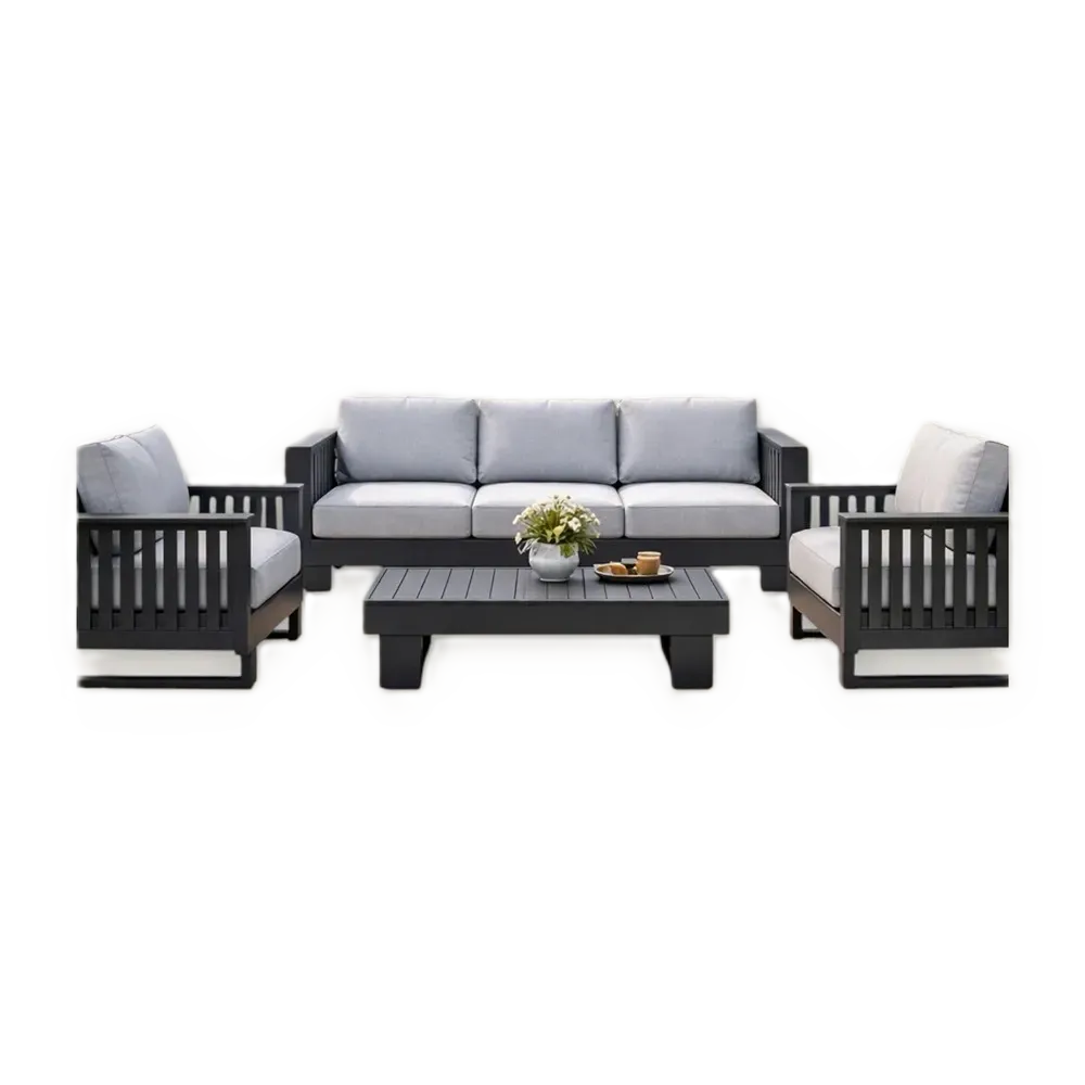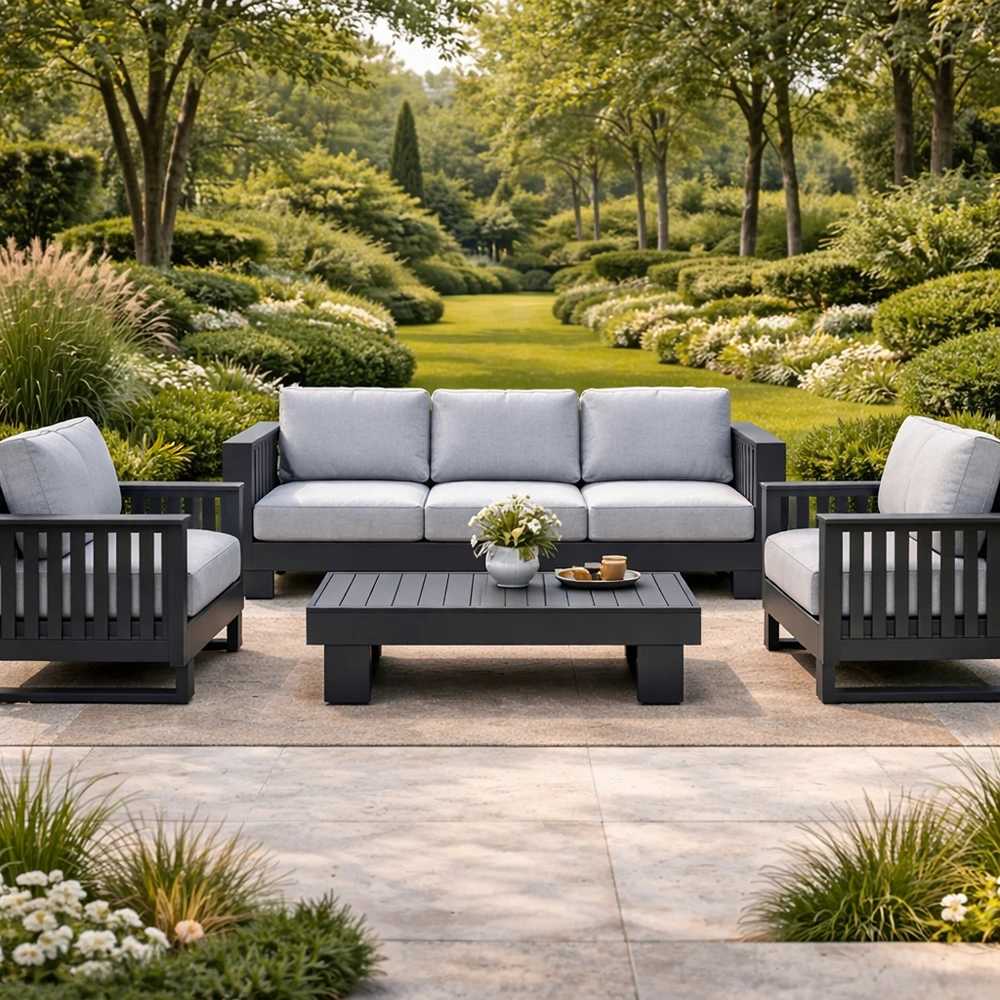 Grey outdoor sofa set with aluminium frame, three-seater, two chairs and a table.