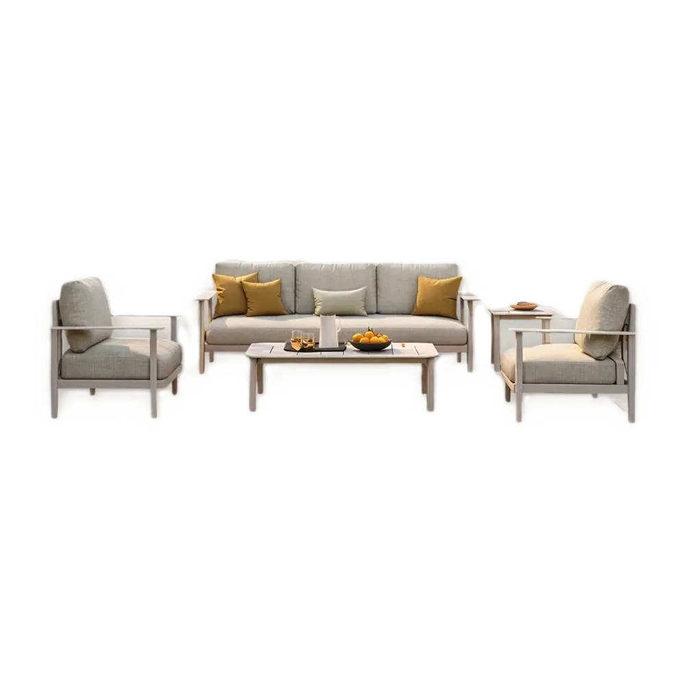 White outdoor sofa set with aluminium frame, three-seater, two chairs and a table.