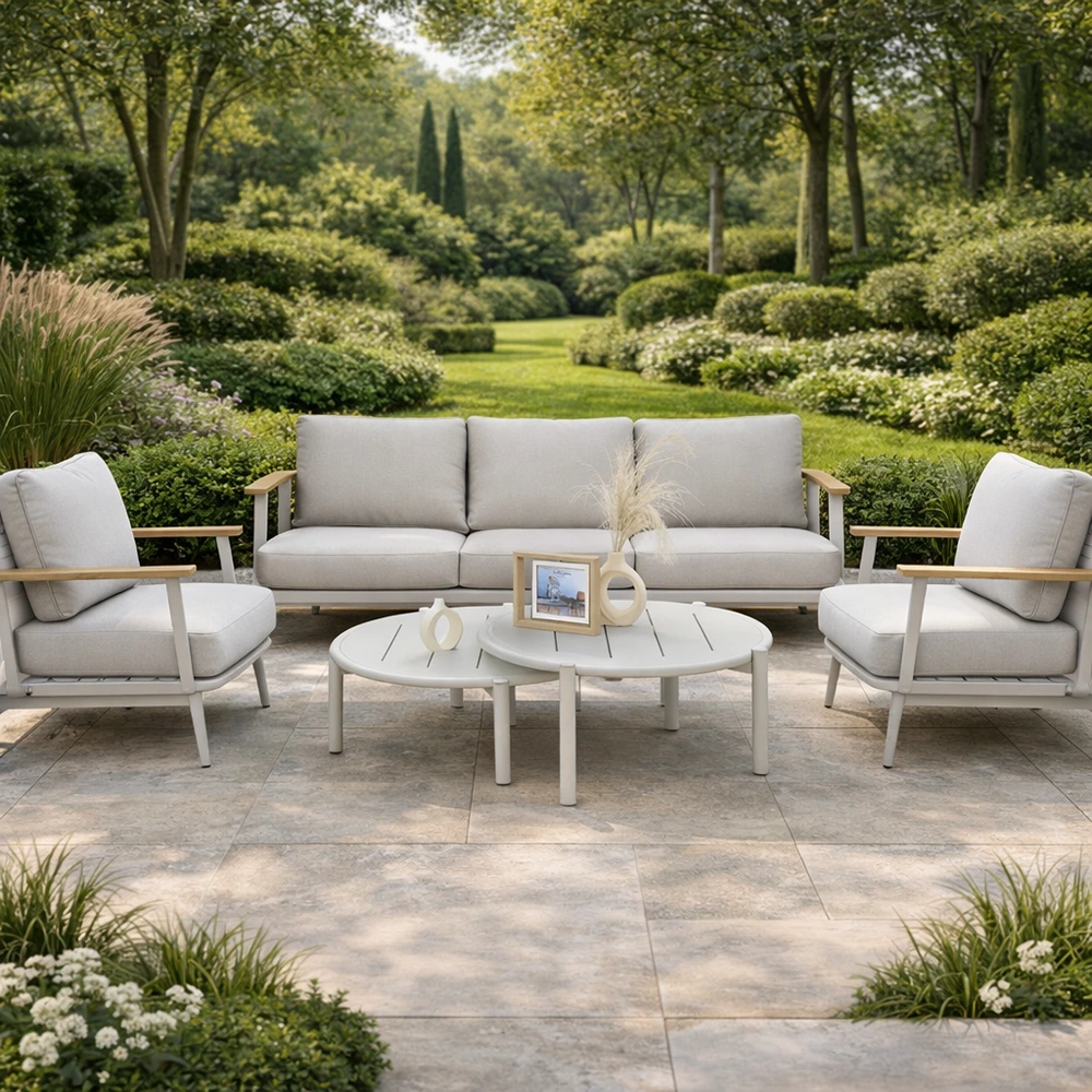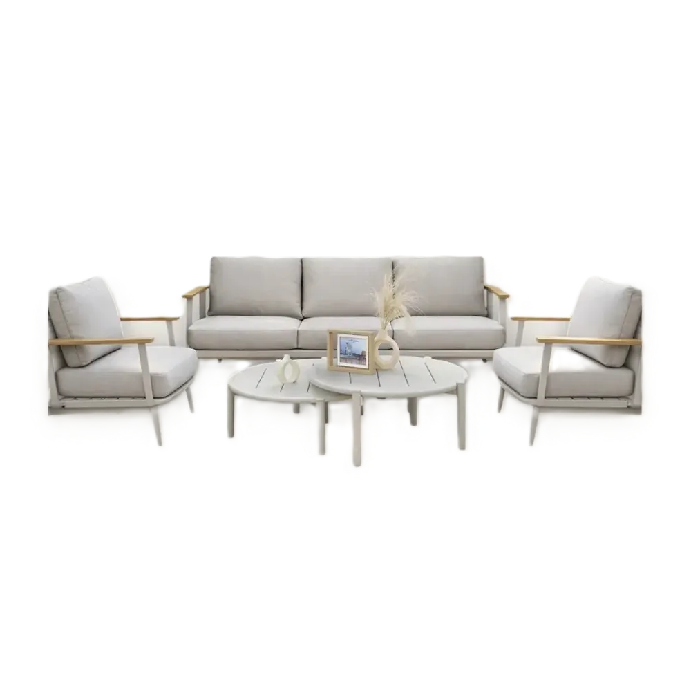 Grey outdoor sofa set with aluminium and teak wood frame, three-seater, two chairs and two tables.