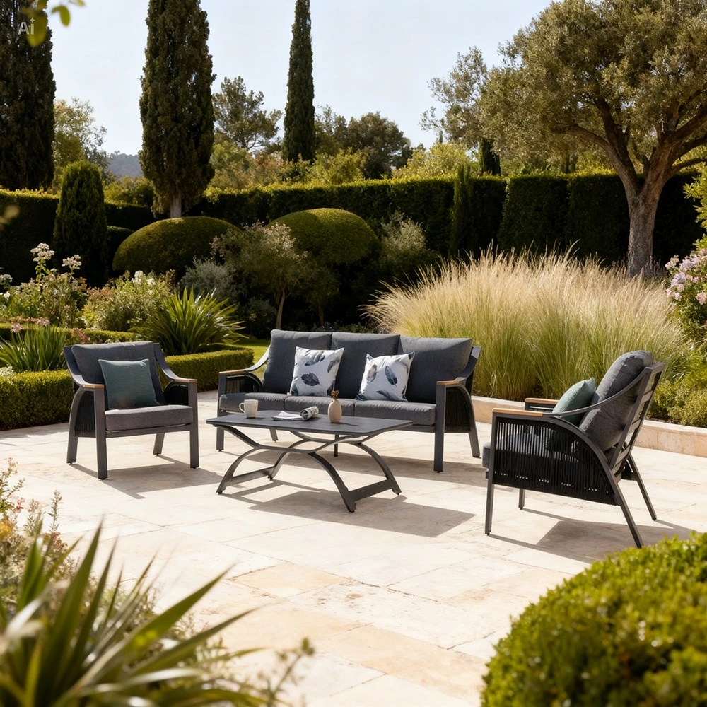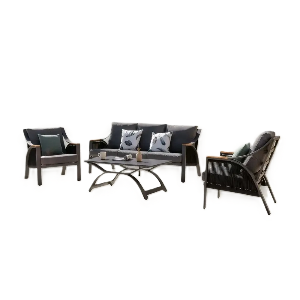 Grey outdoor sofa set with aluminium and teak wood frame, three-seater, two chairs and a table.