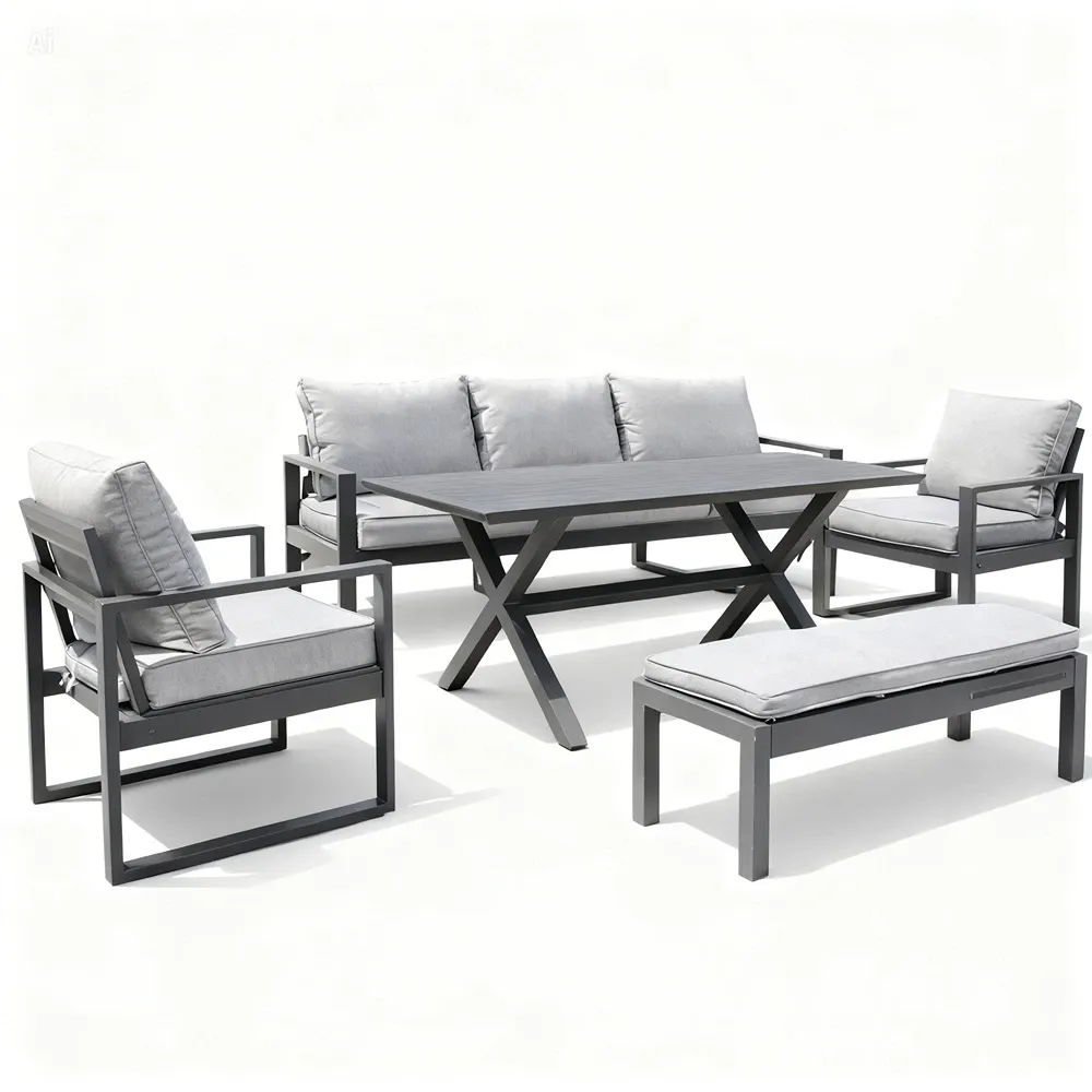 Full grey outdoor sofa set with aluminium frame, three-seater, two chairs, bench and table.