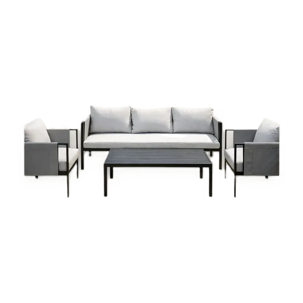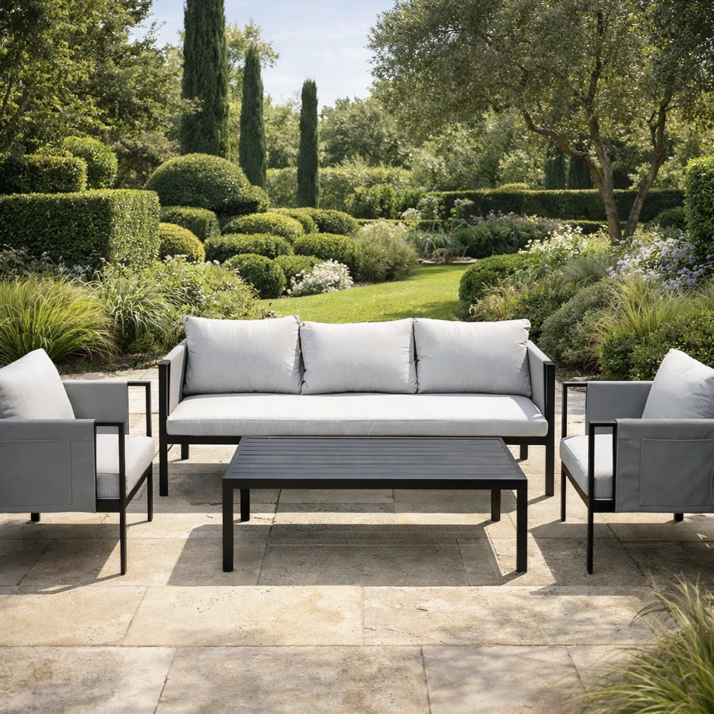 Outdoor sofa set with steel frame, three-seater, two chairs and a table.