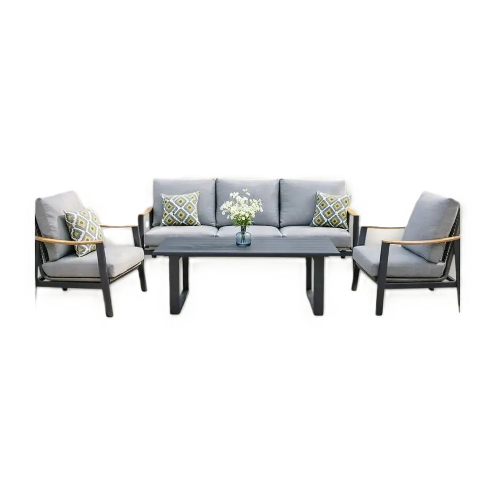 Grey outdoor sofa set with aluminium and teak wood frame, two three-seaters, two chairs and a table.