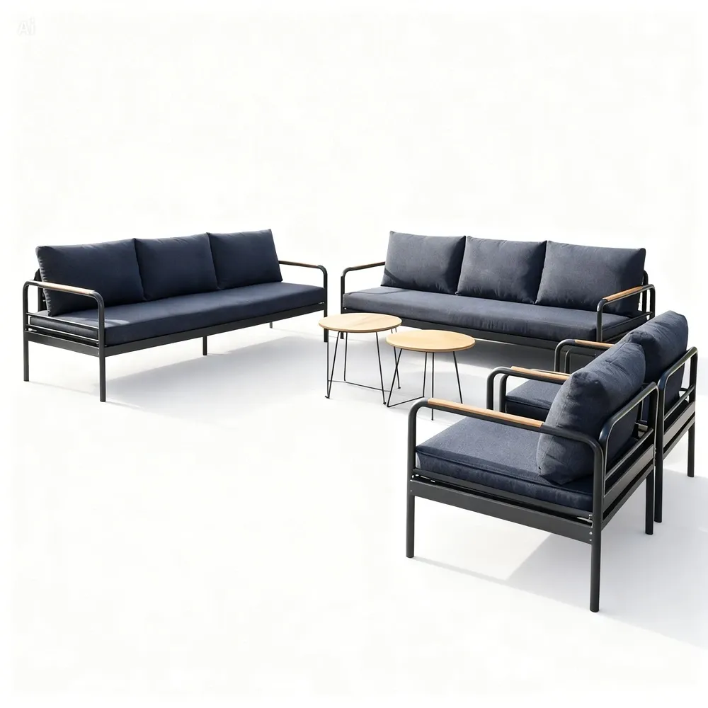Full grey outdoor sofa set with aluminium frame, two three-seaters, two chairs and two tables.