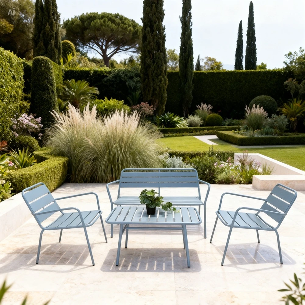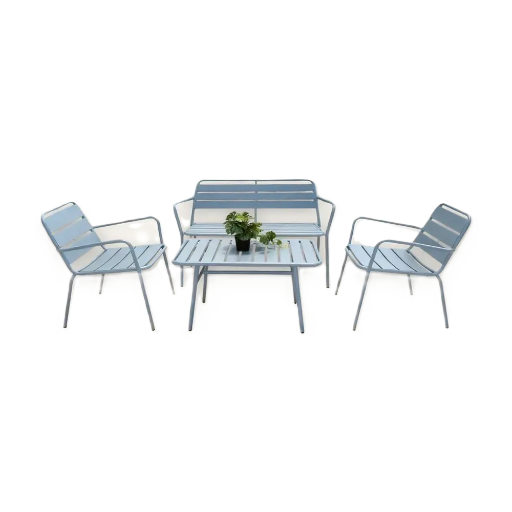 Blue outdoor seating set with steel frame, loveseat, two chairs and a table.