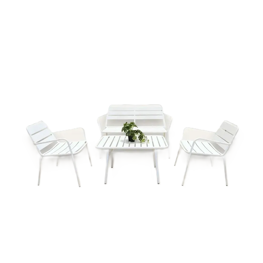 Green outdoor seating set with steel frame, loveseat, two chairs and a table.