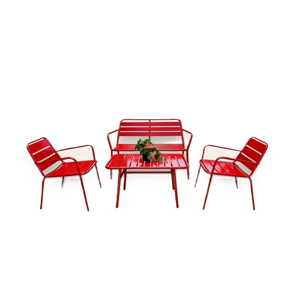 Red outdoor seating set with steel frame, loveseat, two chairs and a table.