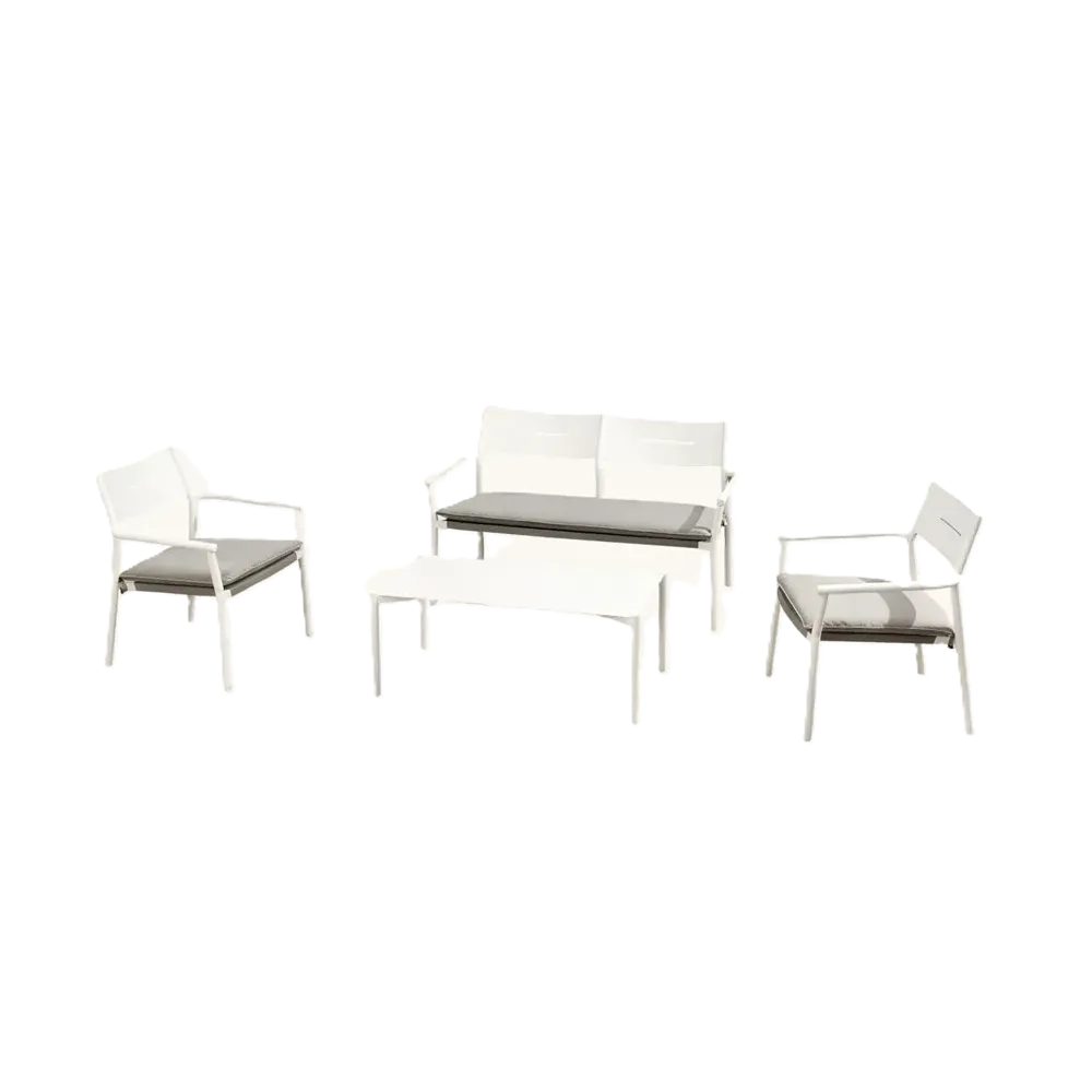 White outdoor sofa set with aluminium frame, loveseat, two chairs and a table.
