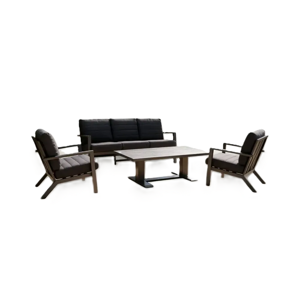 Grey outdoor sofa set with aluminium and polywood frame, three-seater, two chairs and a table, hydraulic adjustable table.