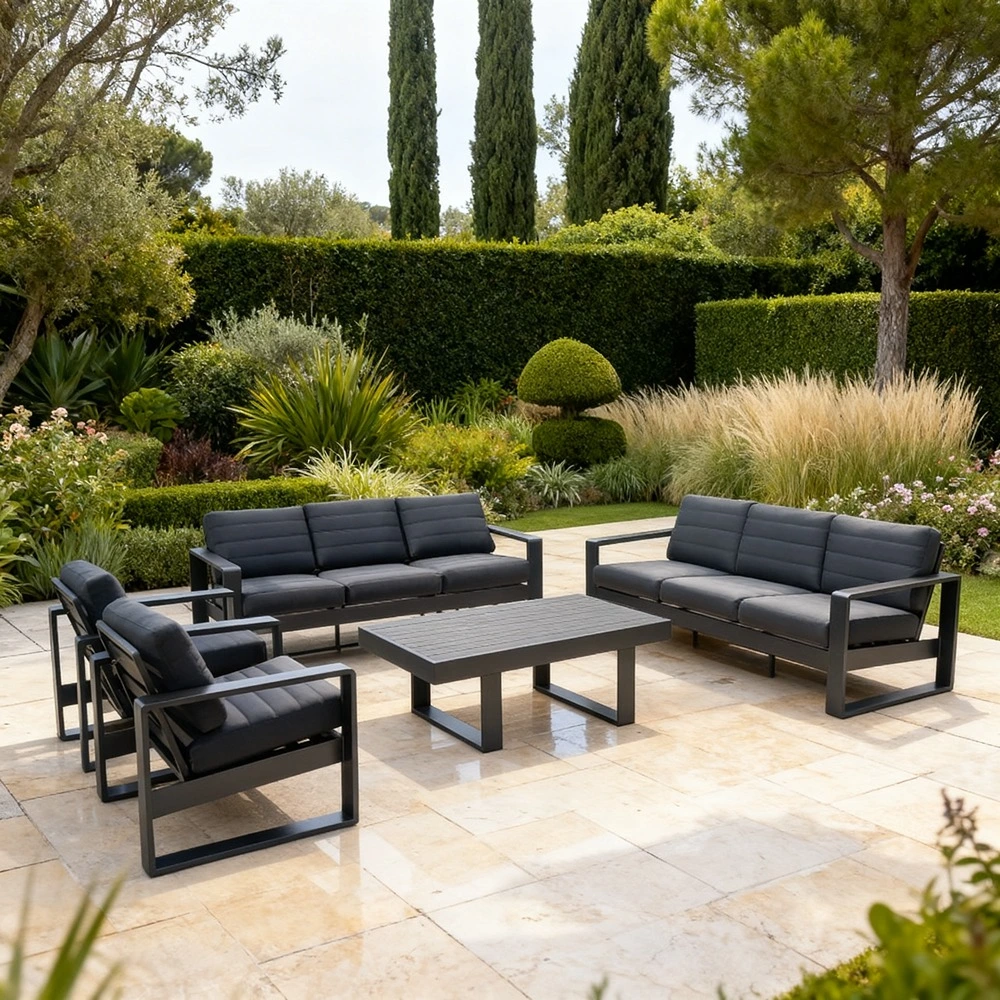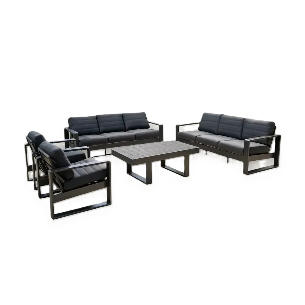 Grey outdoor sofa set with aluminium and polywood frame, two three-seaters, two chairs and a table, hydraulic adjustable table.