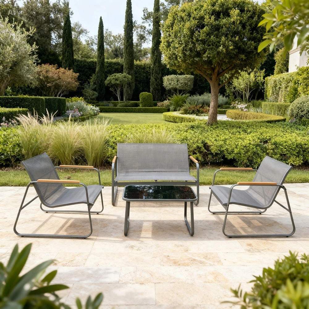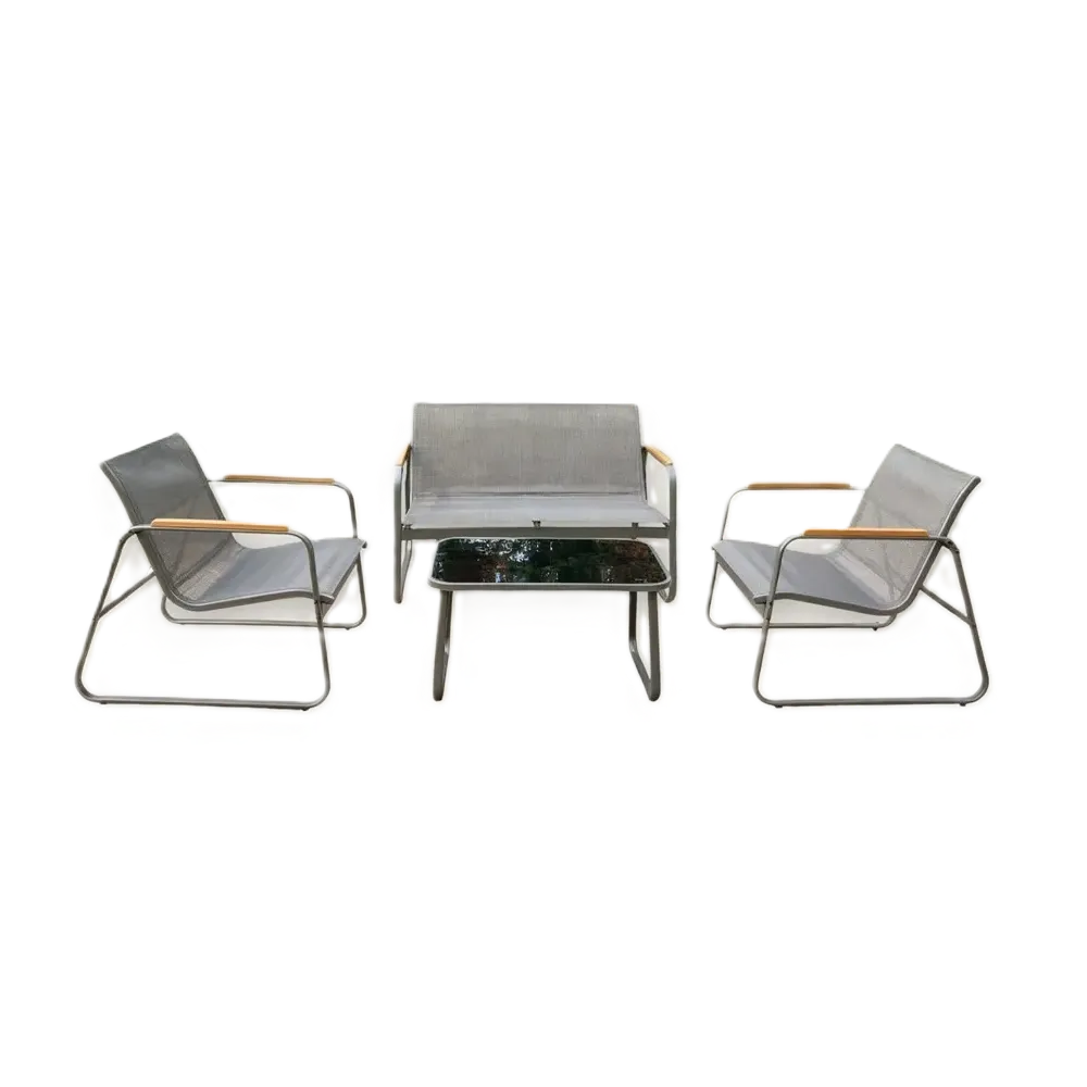 Grey outdoor seating set with polywood and steel frame, loveseat, two chairs and a table.