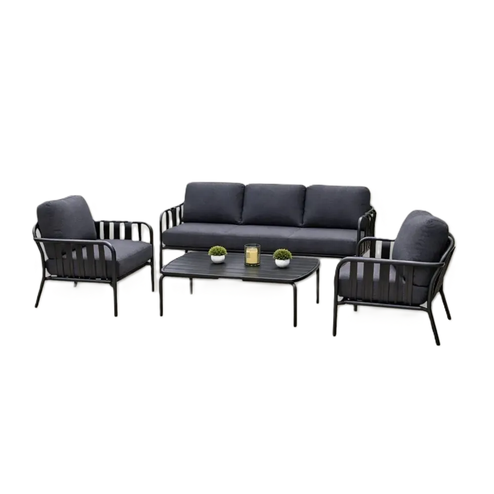 Dark grey outdoor sofa set with aluminium frame, three-seater, two chairs and two tables.