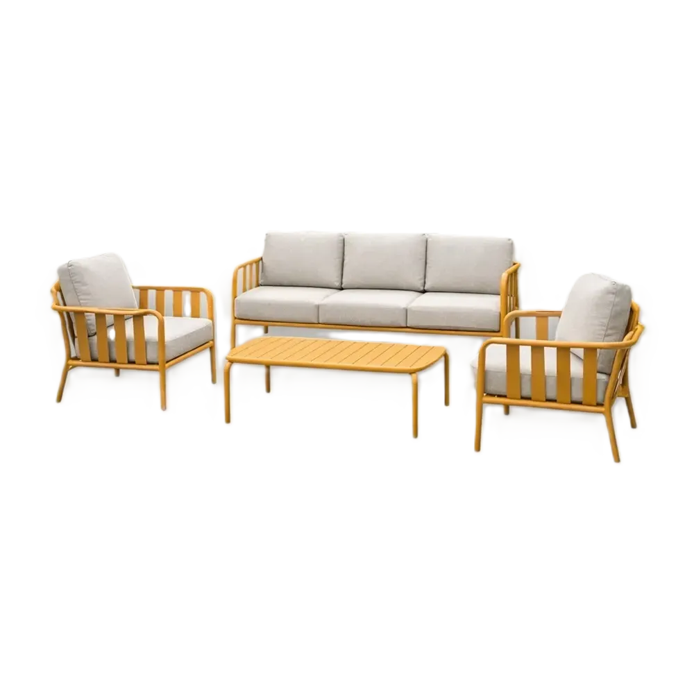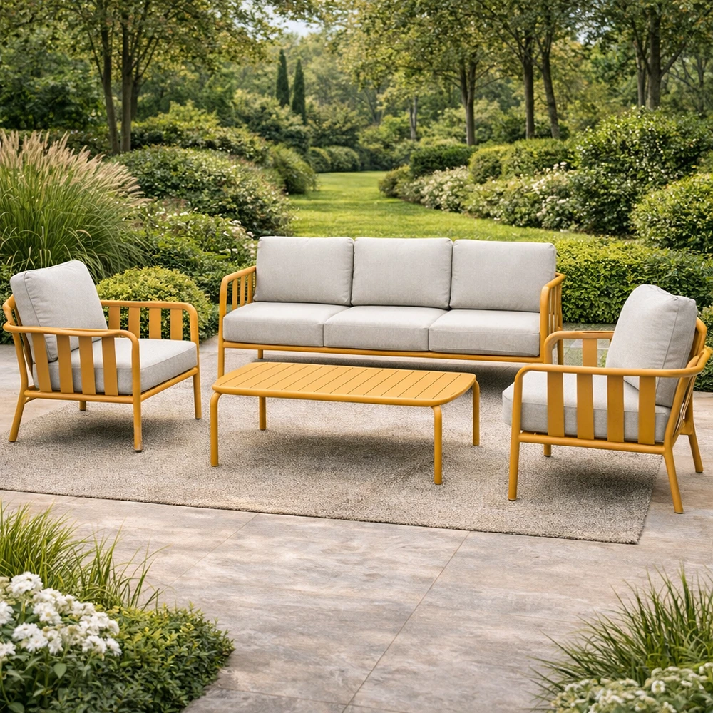 Yellow outdoor sofa set with aluminium frame, three-seater, two chairs and two tables.