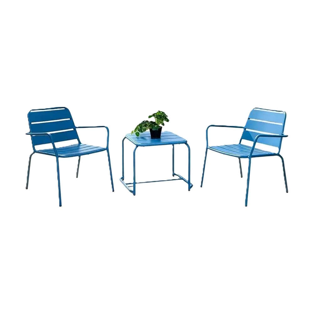 Blue outdoor bistro set with steel frame, two chairs and a table.
