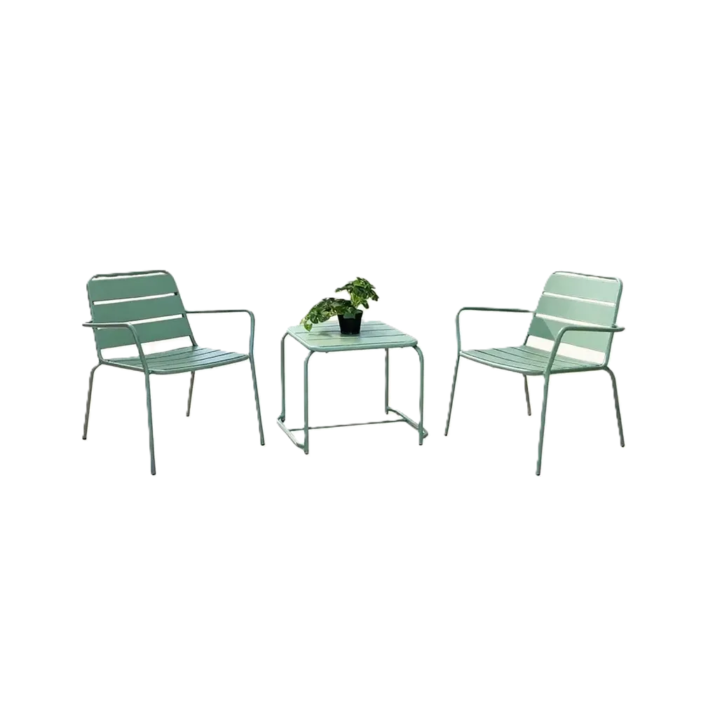 Green outdoor bistro set with steel frame, two chairs and a table.