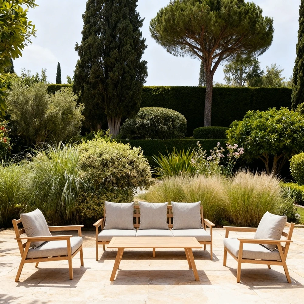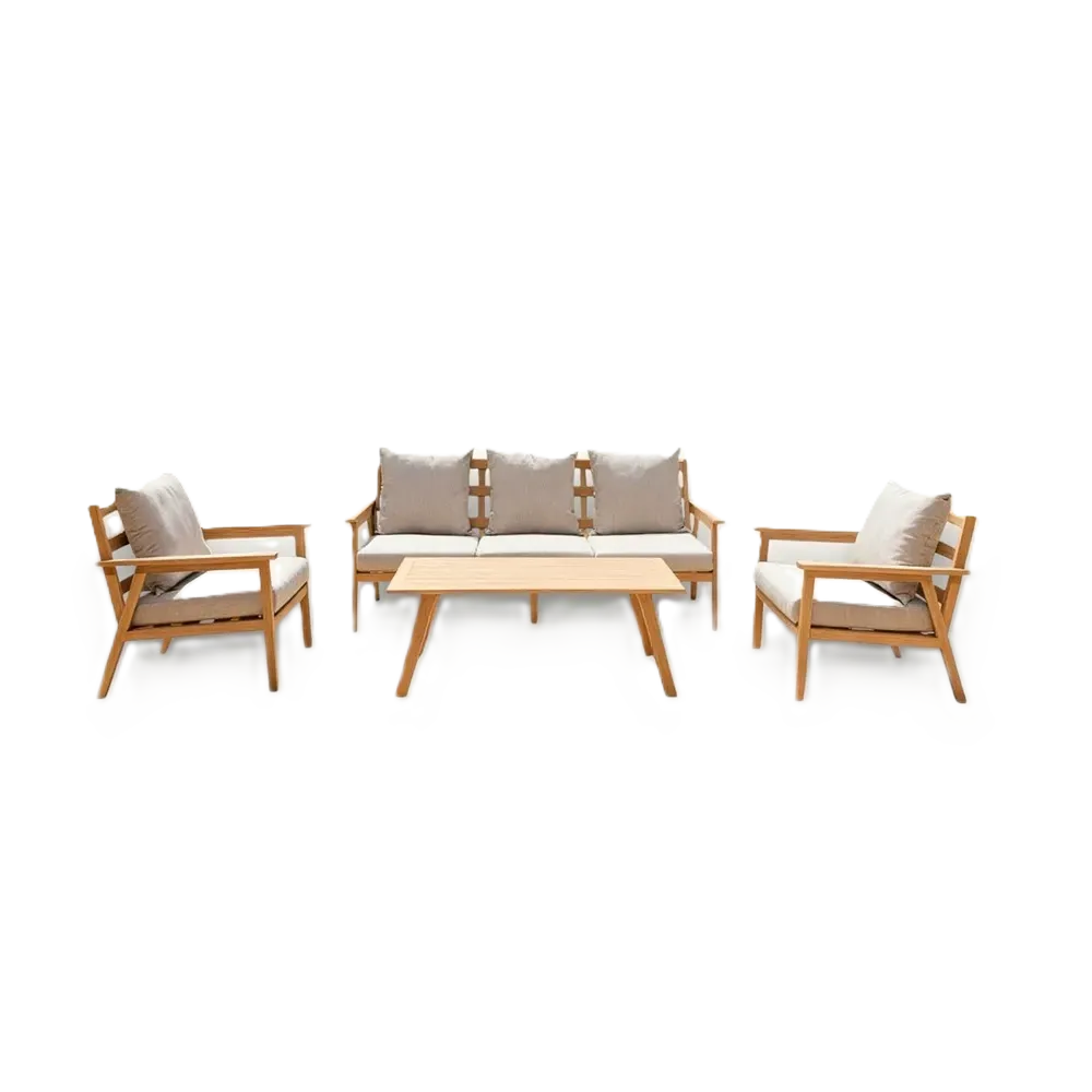 Wood-look outdoor sofa set with aluminium frame, three-seater, two chairs and a table.